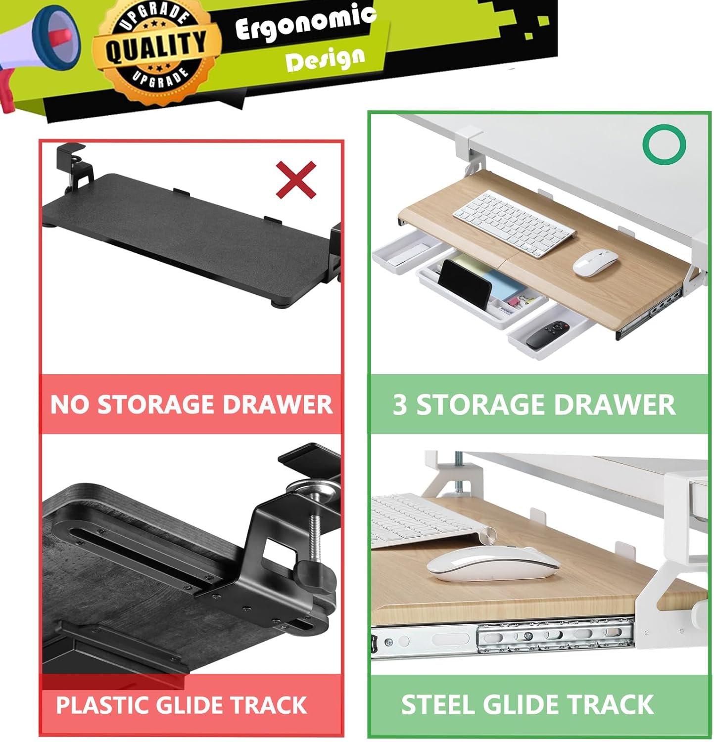 - EXTRA LARGE SURFACE & 3-DRAWERS: ETHU desk keyboard tray measures 26.77”(L) x 12.2”(W) and supports up to 22 lbs. There are three drawers. They double up as smart storage for your keyboard, and mouse with extra room to spare for your phone, and other items and free up your desktop. It is a clever solution for small offices or when you’re working from home