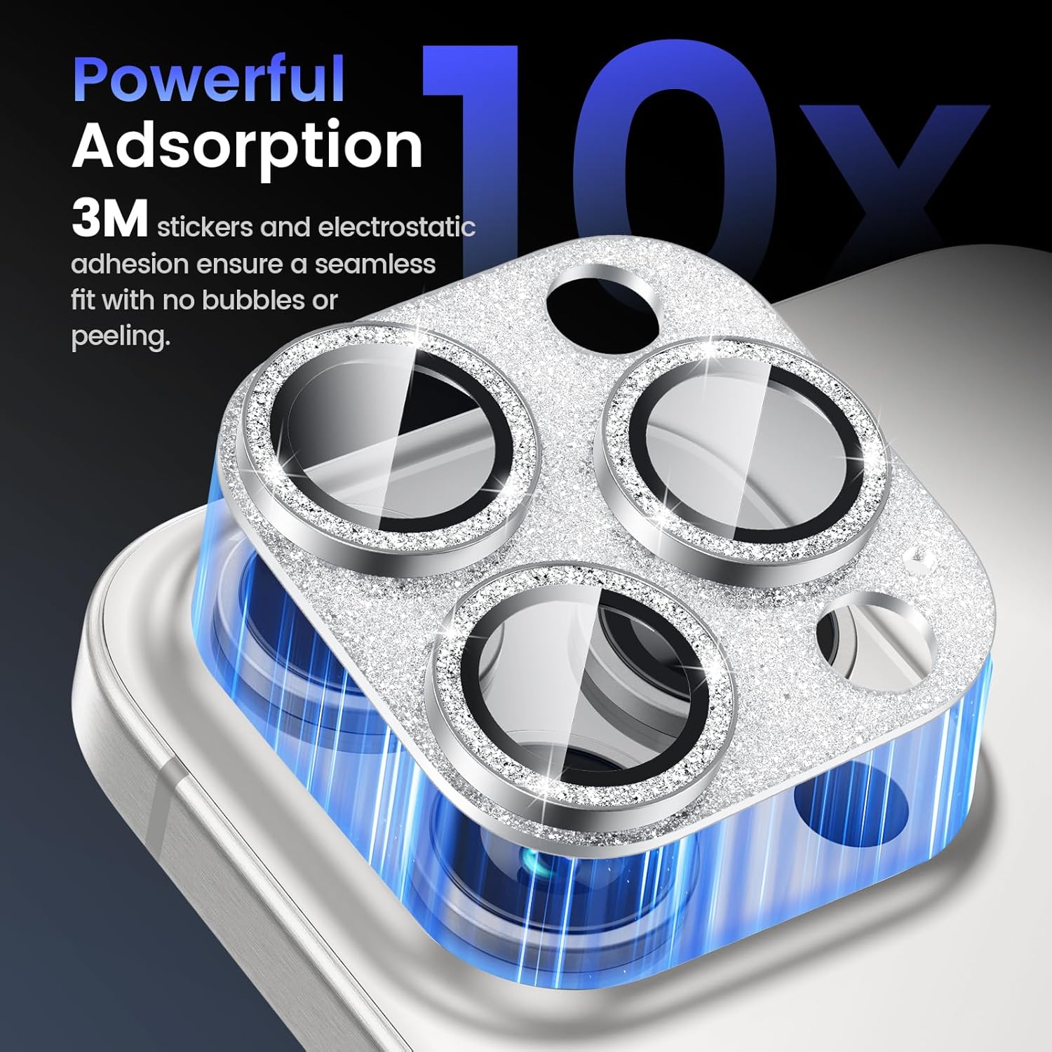 - GLITTER TEXTURE- Upgraded tempered glass camera screen protector cover built-in 3 single metal ring protector, which bling glitter reflects fascinatingly. It protects lens also makes it personalized decorations. Many colors are available for you to choose