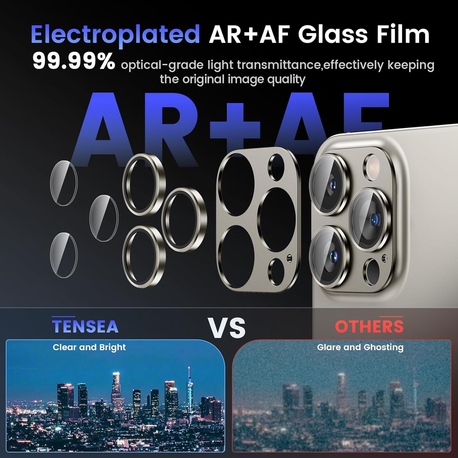• COMPATIBILITY- Tensea rear camera protector made by 9H tempered glass and aluminum alloy is designed for iPhone 16 Pro 6.3inch / iPhone 16 Pro Max 6.9inch with THREE camera lens. The protector de camara full covers your phone lens. No bubbles, Case friendly, leave no residue after removed. NOTE: Not fit for iPhone 16/iPhone 16 Plus with two camera lens