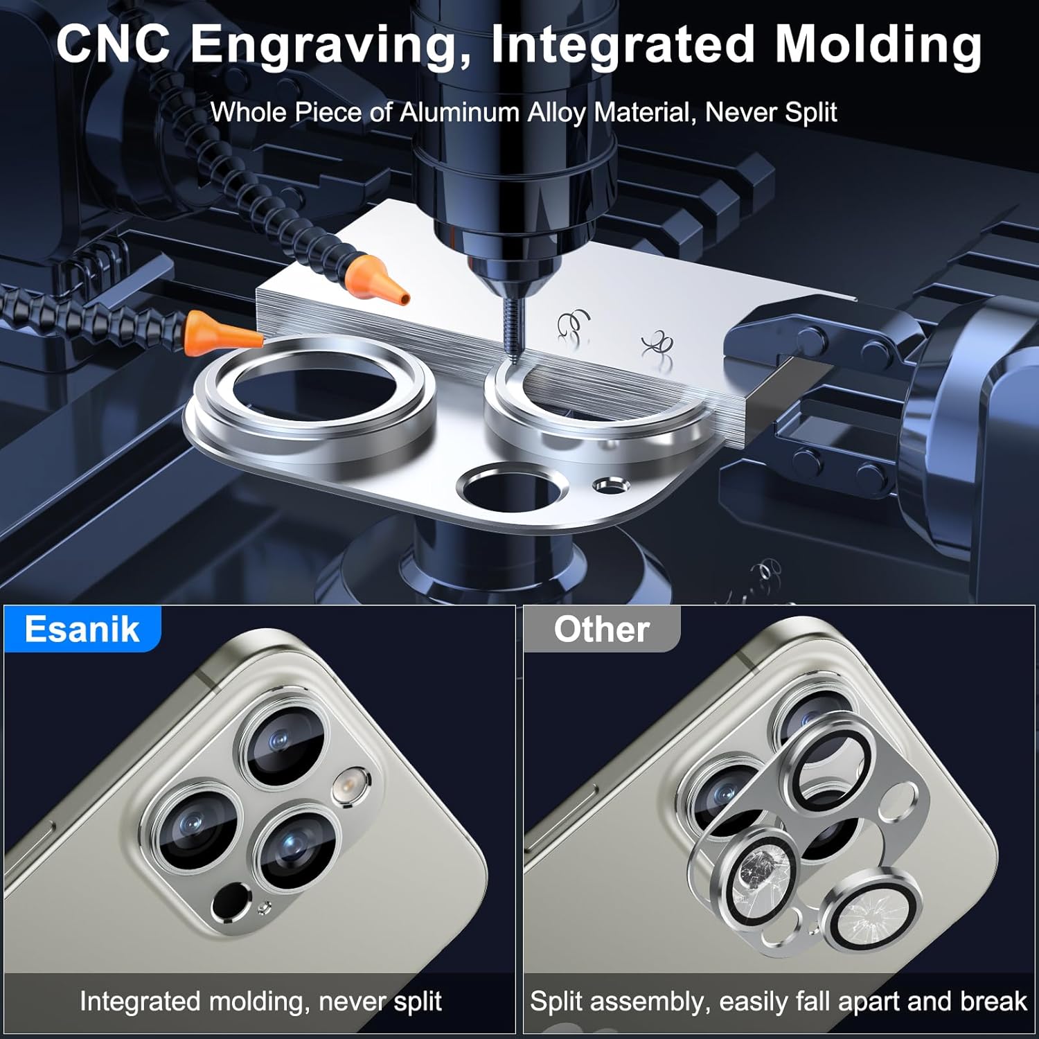 - 【CNC Engraving & Integrated Molding】 Esanik 2024 Upgrade Version iPhone 16 pro max / iPhone 16 Pro Cam Cover is precisely carved from whole piece of high-quality aluminum alloy, firm and long lasting. Bid farewell to the split and falling apart issues resulting from the conventional split assembly process.