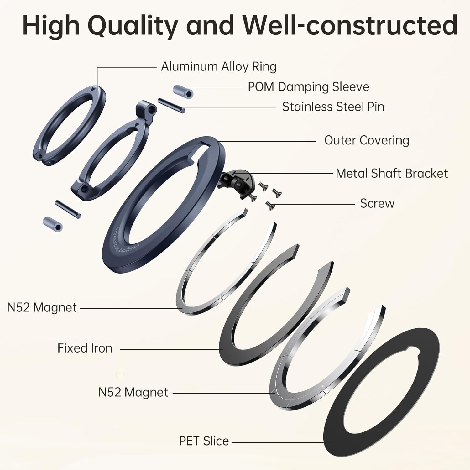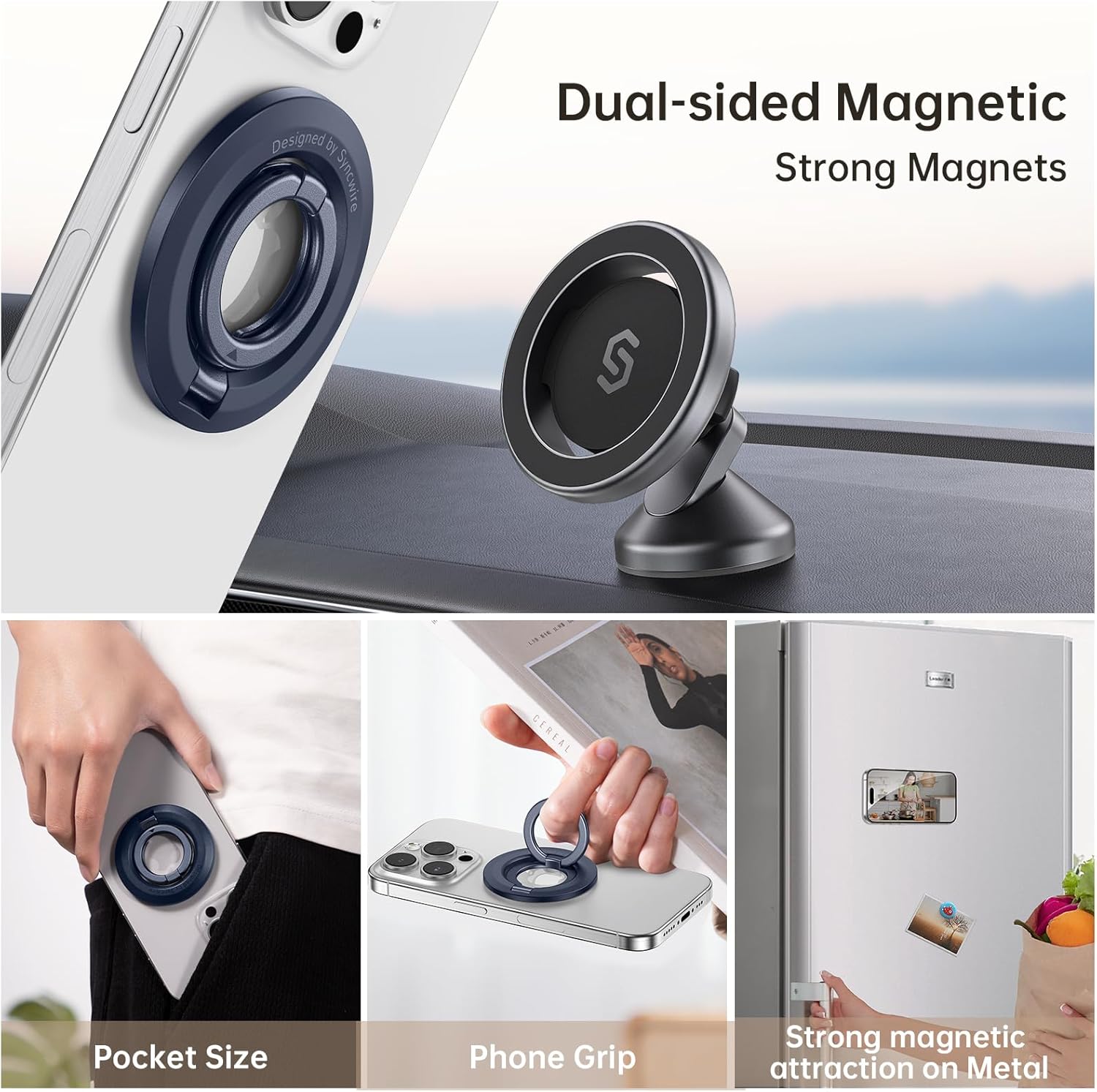 - [Dual-sided Magnetic] The unique dual-layer magnet plus one layer of iron stacking design enables dual-sided magnetic functionality, allowing it to be used with MagSafe car mounts without removing the ring. This MagSafe ring holder can be attached to almost any iron metal surface, such as fitness equipment, refrigerators, toasters, etc., making it convenient for taking selfies, watching videos, and browsing information.