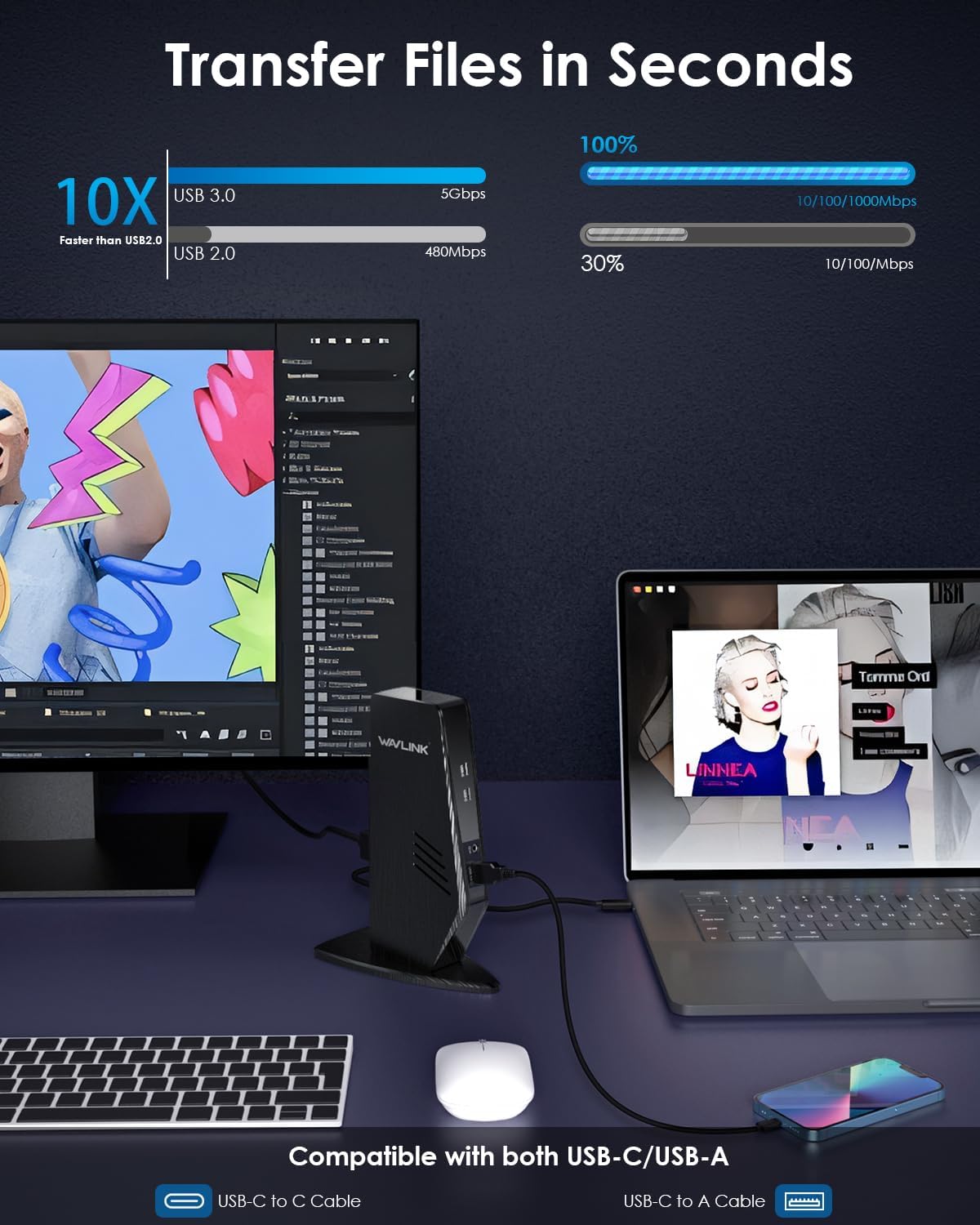 - Universal Docking Station: The Computer dock fully compatible with USB Type-C ,Type-A and Thunderbolt 3 laptops and desktops. Ideal for Home Office, entertainment, online education (Both USB-C to USB-C and USB-A to USB-C cables included).Note: This product requires a USB Type-C cable that supports data transfer and cannot use a dual C-type charging cable.