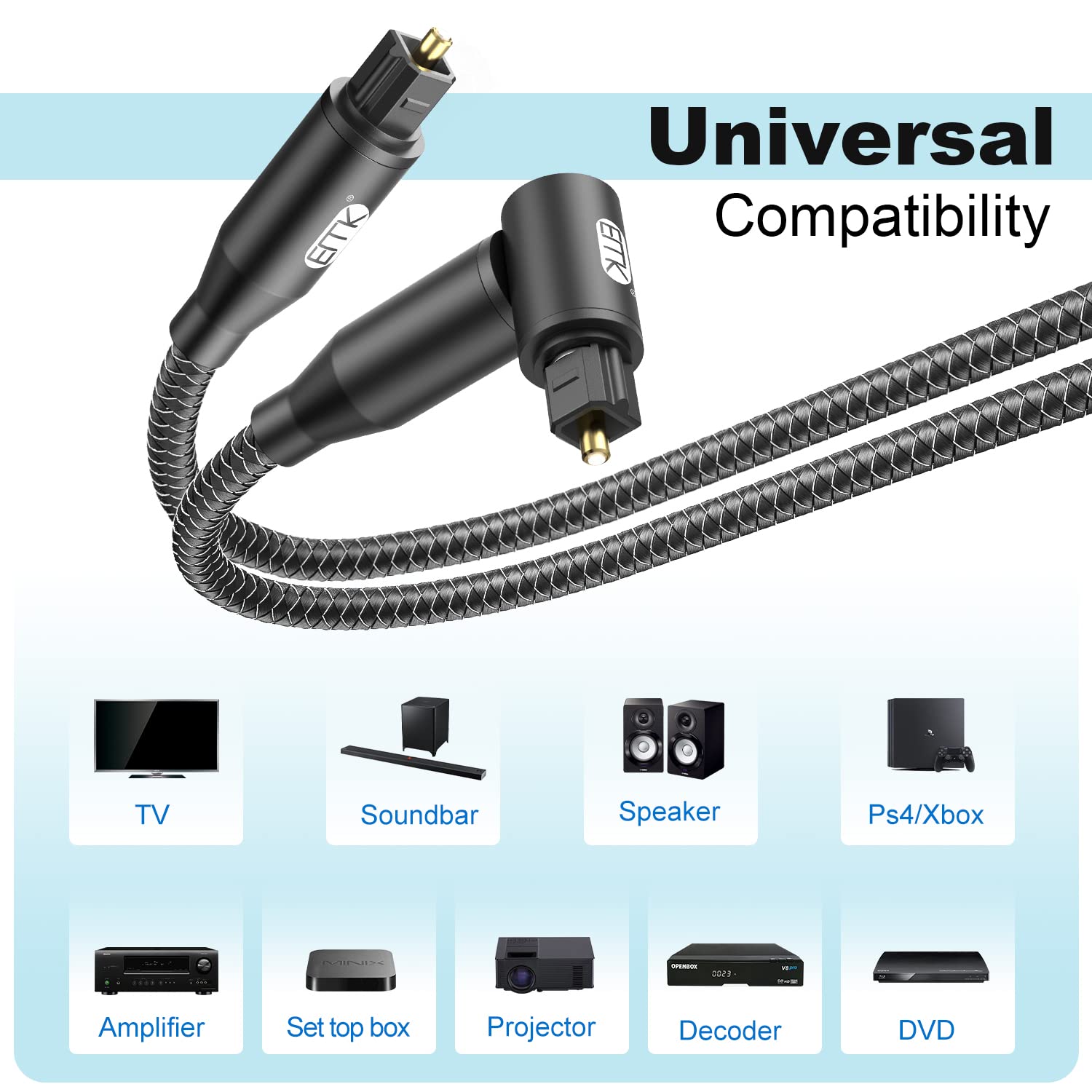 - Superior Hi-Fi Sound Performance - This premium optical audio cable delivers studio-grade digital audio transmission, perfectly connecting soundbars to receivers, preamps, DACs and audio processors while supporting uncompressed PCM, 5.1/7.1 surround sound (Dolby Digital Plus, DTS-HD High Resolution), ADAT and LPCM formats for pristine, interference-free audio reproduction.