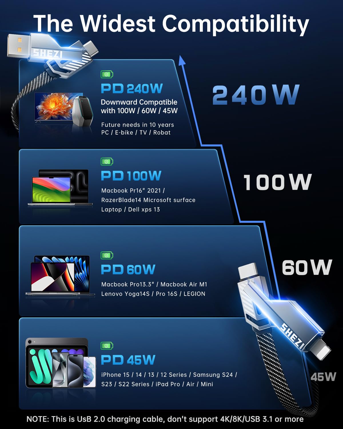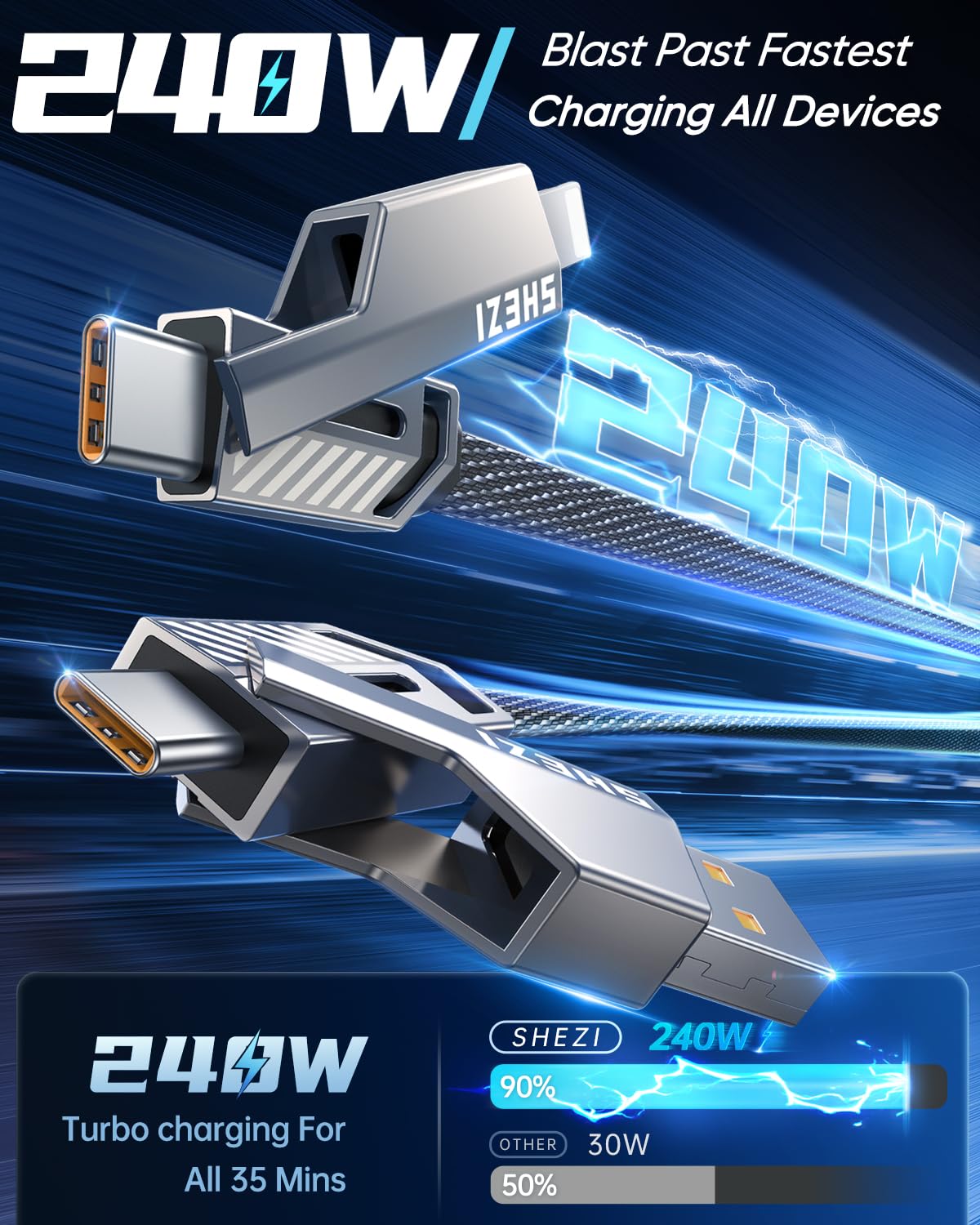 - 240W High-Speed Charging: Our multi-charging cable is equipped with 60W charging power, allowing you to get the power required for one day in 35 minutes. Note: To achieve 60w fast charging, please be equipped with a charging adapter of more than 240W