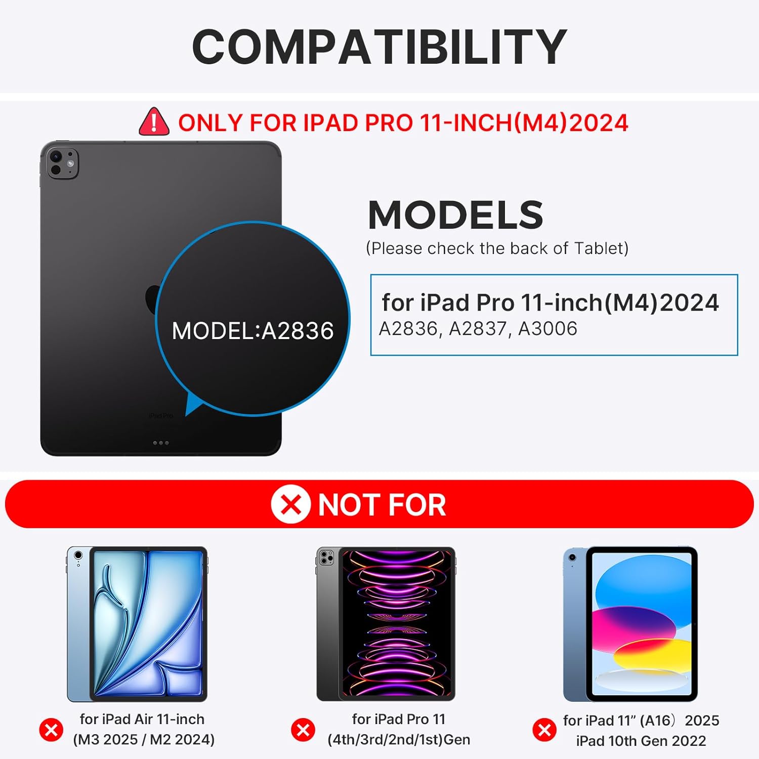 - ๐๐ผ๐บ๐ฝ๐ฎ๐๐ถ๐ฏ๐ถ๐น๐ถ๐๐: Elevate your iPad Pro 11 inch (M4) 2024 experience with our versatile keyboard case. models include 2024 iPad Pro 11 inch(A2836, A2837, A3006);NOTE:NOT FIT FOR IPAD AIR 11 (M3 2025 / M2 2024) & IPAD 11TH A16 2025,Weโre happy to help! Reach out to us if you need to check compatibility.