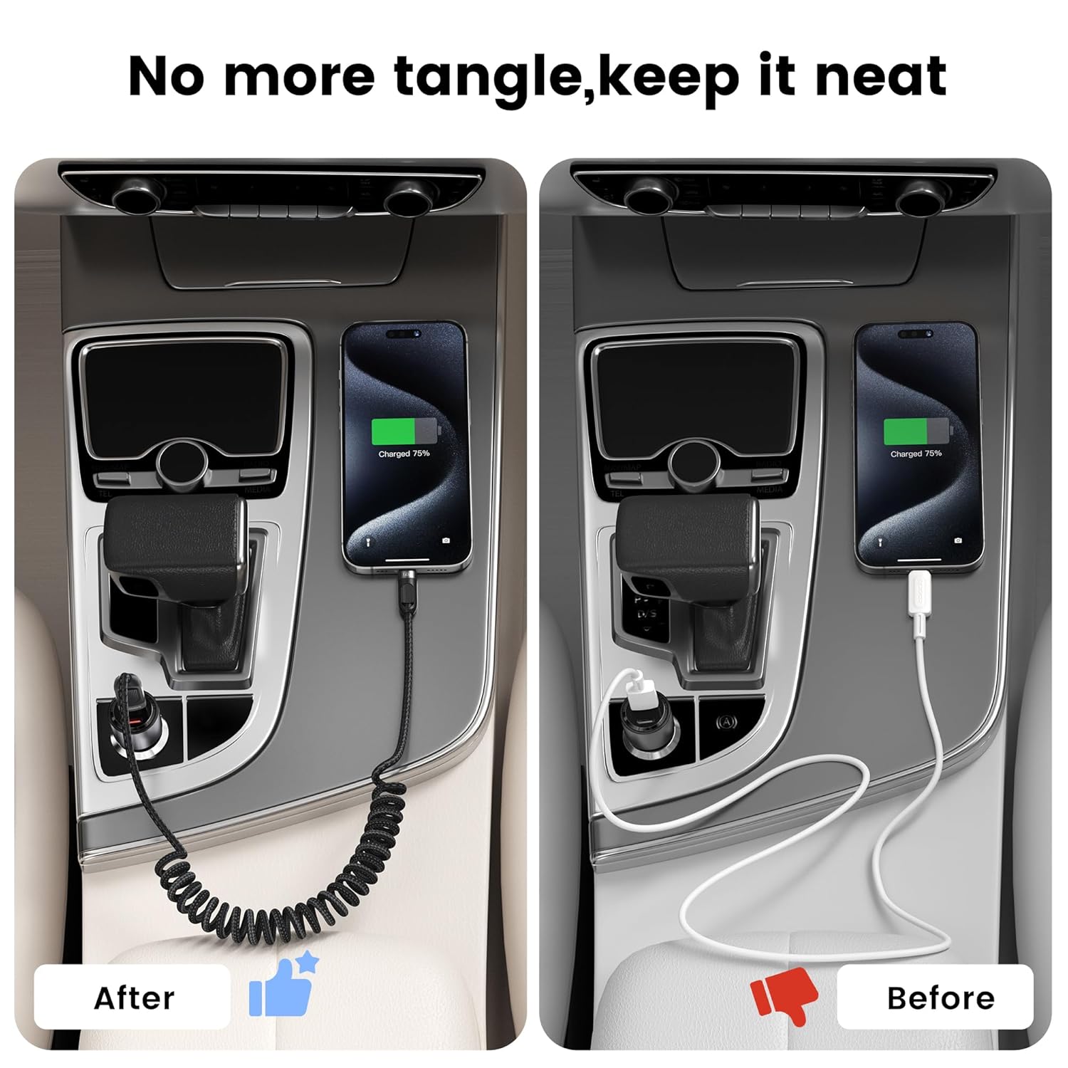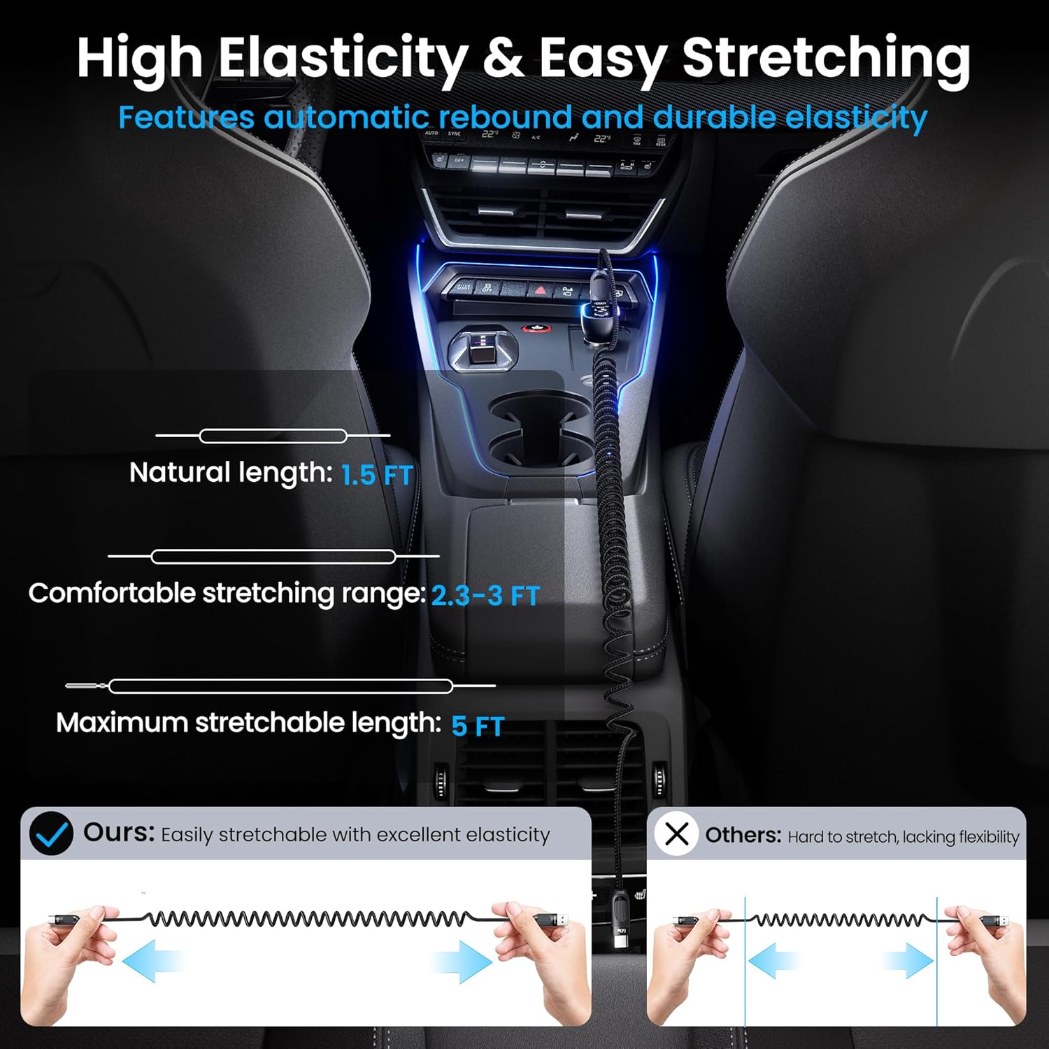 - CarPlay-Optimized Stability & Reach:Specifically engineered for CarPlay integration, ensure compatibility with all iPhone models (including iPhone 16/15 Pro series) and vehicle infotainment systems. The 3FT elastic range adapts to various dashboard/console distances, while connectors maintain stable connections during sudden stops or sharp turns - eliminating frustrating disconnections during navigation. Its low-profile USB C head fits snugly into tight car ports, allowing full touchscreen access without cable interference