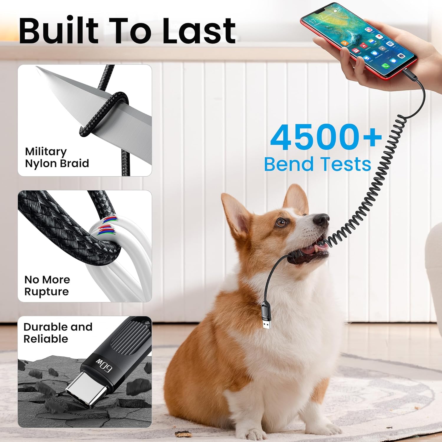 - 60W Hyper-Charging & 480Mbps Sync: Supporting PD3.0/QC3.0 protocols, this dual-protocol coiled USB A to USB C cable delivers up to 60W charging power (20V/3A) for USB C devices, while the USB A end provides 3A fast charging. Experience blazing-fast 480Mbps data transfer speeds for seamless Android Auto mirroring or iPhone syncing - no more sluggish charging in your vehicle
