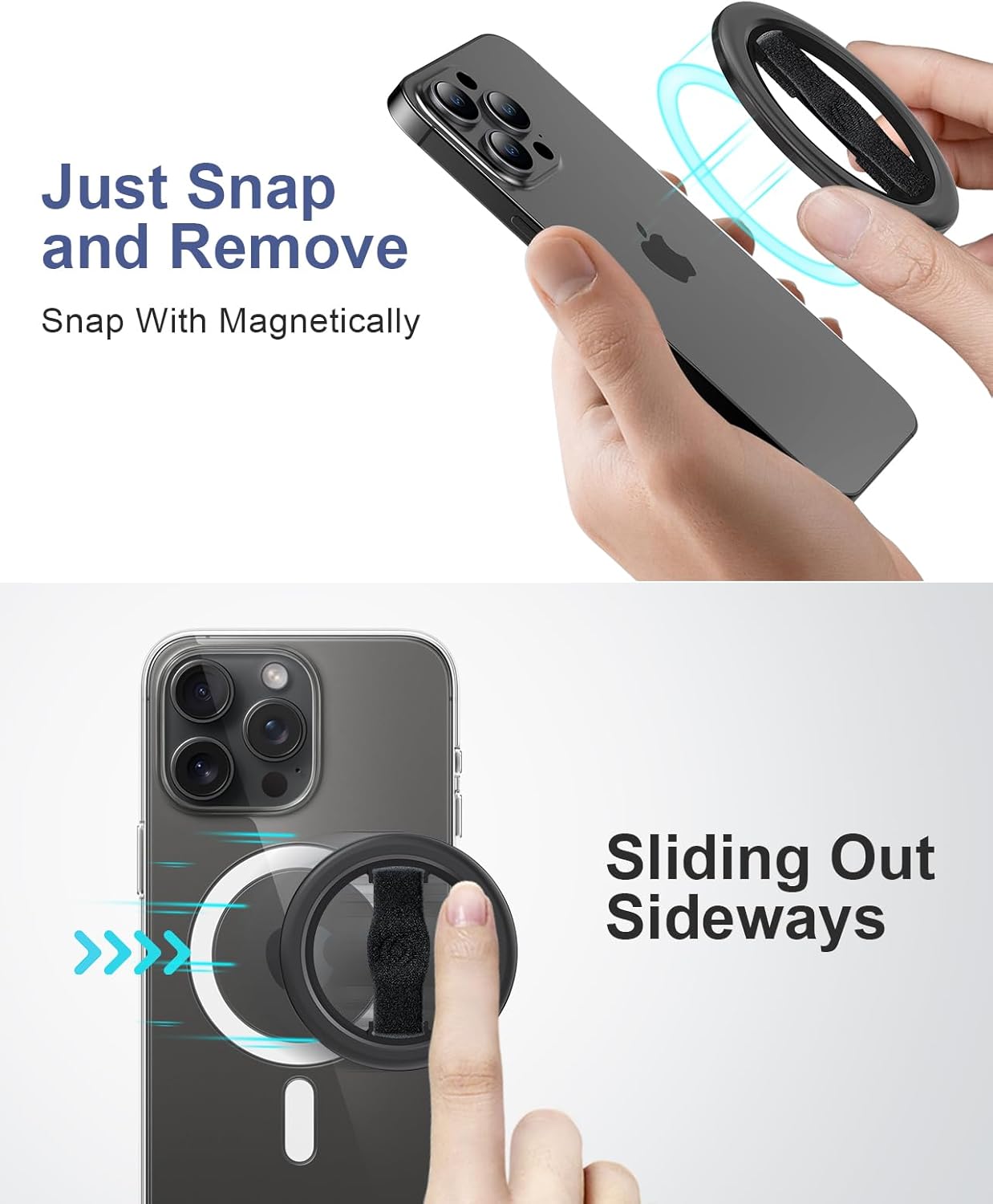 EWA MagOne Lite 3rd Gen Cell Phone Ring Holder, with Replaceable 360° Rotation Elastic Finger Strap, Phone Grip Compatible with iPhone MagSafe,15,14,13 Pro/Max/Plus-(Black)