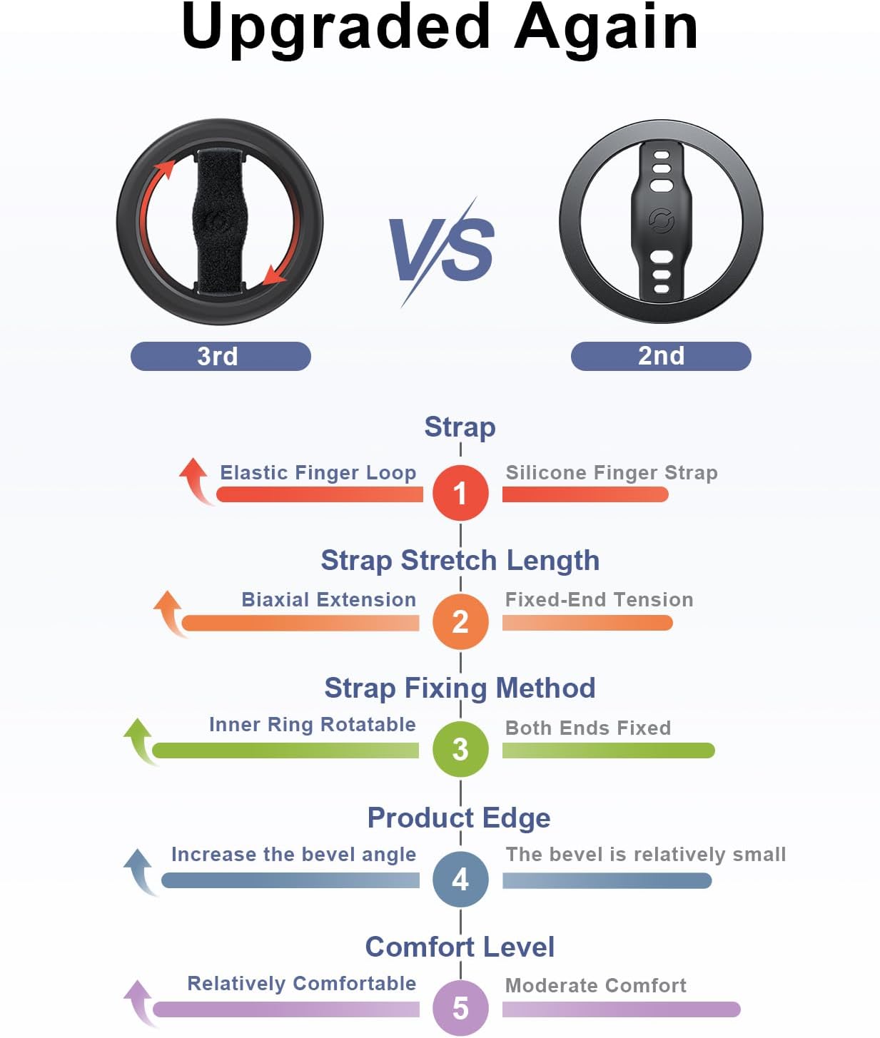 - Comfortable Elastic Phone Grip: This strap features a more comfortable and highly stretchable high-elastic strap, with a looped band that offers double the extension length, greatly reduced the pressure on the fingers when using the strap. The strap is fixed on a rotatable inner ring, allowing you to easily adjust your phone to the most comfortable angle while using the grip.