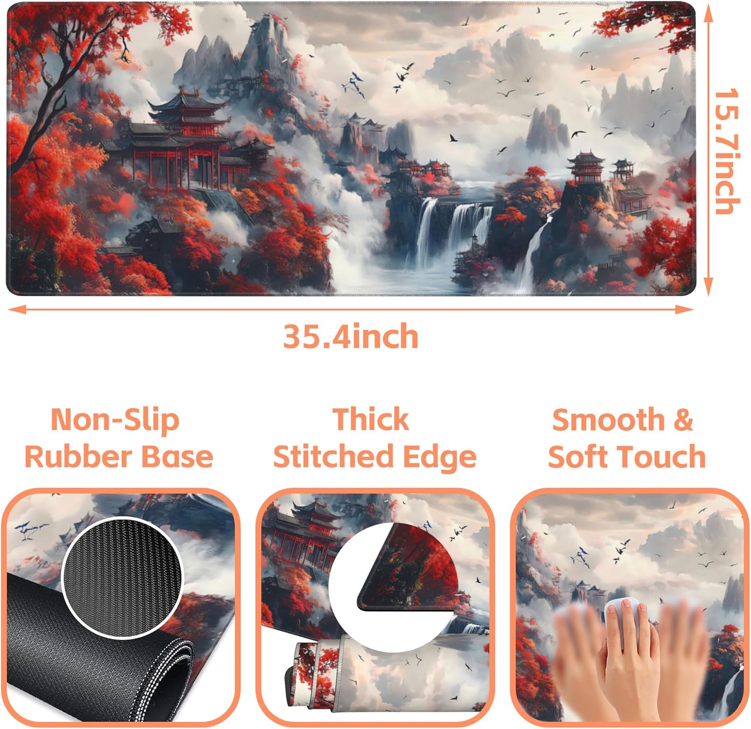 Mouse Pad Large Chinese-Style Landscape Painting Non-Slip Gaming Desk Mat with Stitched Edge Laptop Keyboard Desk Pad for Work Home Gaming (35.4 x 15.7 Inches)