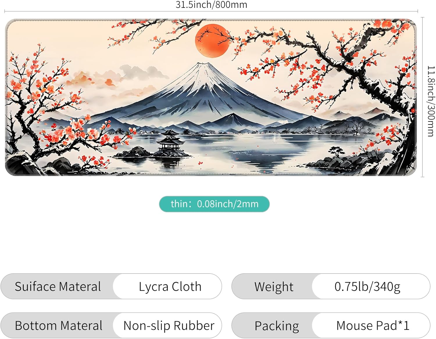 Dynippy Thin Extended Gaming Mouse Pad (31.5 * 11.8 * 0.08 inch) with Stitched Edges Large Mousepad Long XXL Keyboard and Mouse pad Desk Mat for Gaming Office & Home - Japanese Landscape