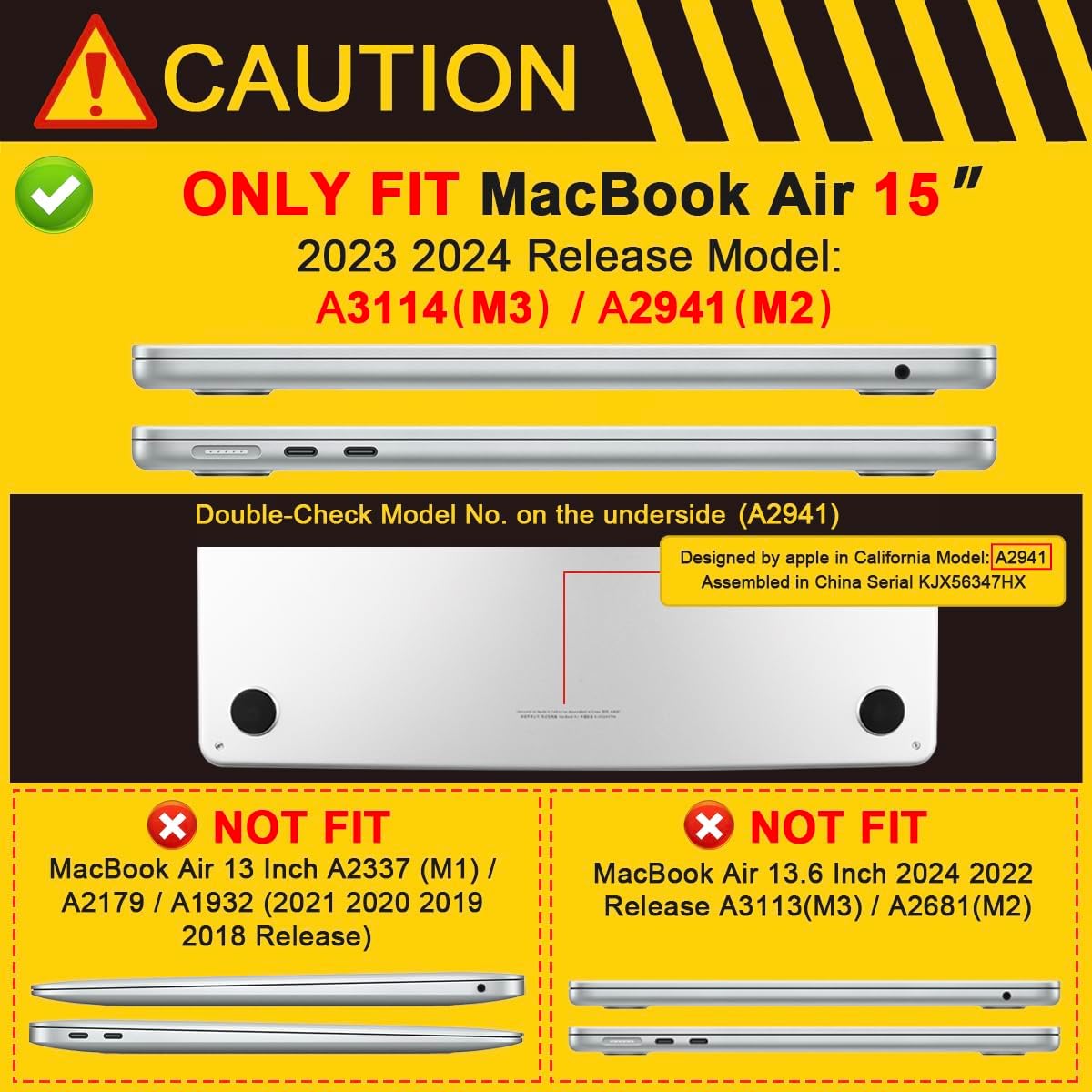 - Case Only Compatible for New MacBook Air 15.3-inch (diagonal) 2025 2024 2023 release with M4/M3/M2 Chip Model number:A3241/A3114/A2941.Note: different models correspond to different case,please check the model carefully before order.