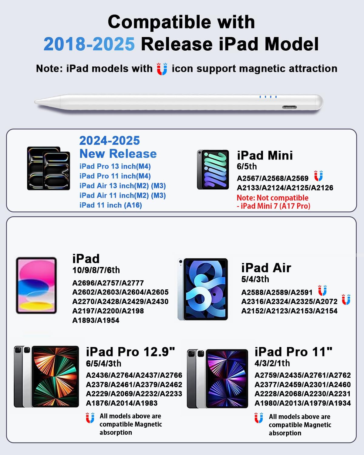 - ăOnly Compatible with iPadă This iPad pencil is Only compatible with 2018-2025 apple iPad Air 11-inch & 13-inch (M2) (M3), iPad Pro 11-inch & 13-inch (M4), iPad 6/7/8/9/10/11(A16) Gen, iPad Pro 11-inch 1/2/3/4 Gen, iPad Pro 12.9-inch 3/4/5/6 Gen, iPad Air 3/4/5 Gen, iPad Mini 5/6 Gen.ăNoteăThis stylus is NOT compatible with models prior to 2018 and does NOT work with iPhone, Android and Microsoft devices. Before purchasing, please make sure to check the model on the back of the iPad