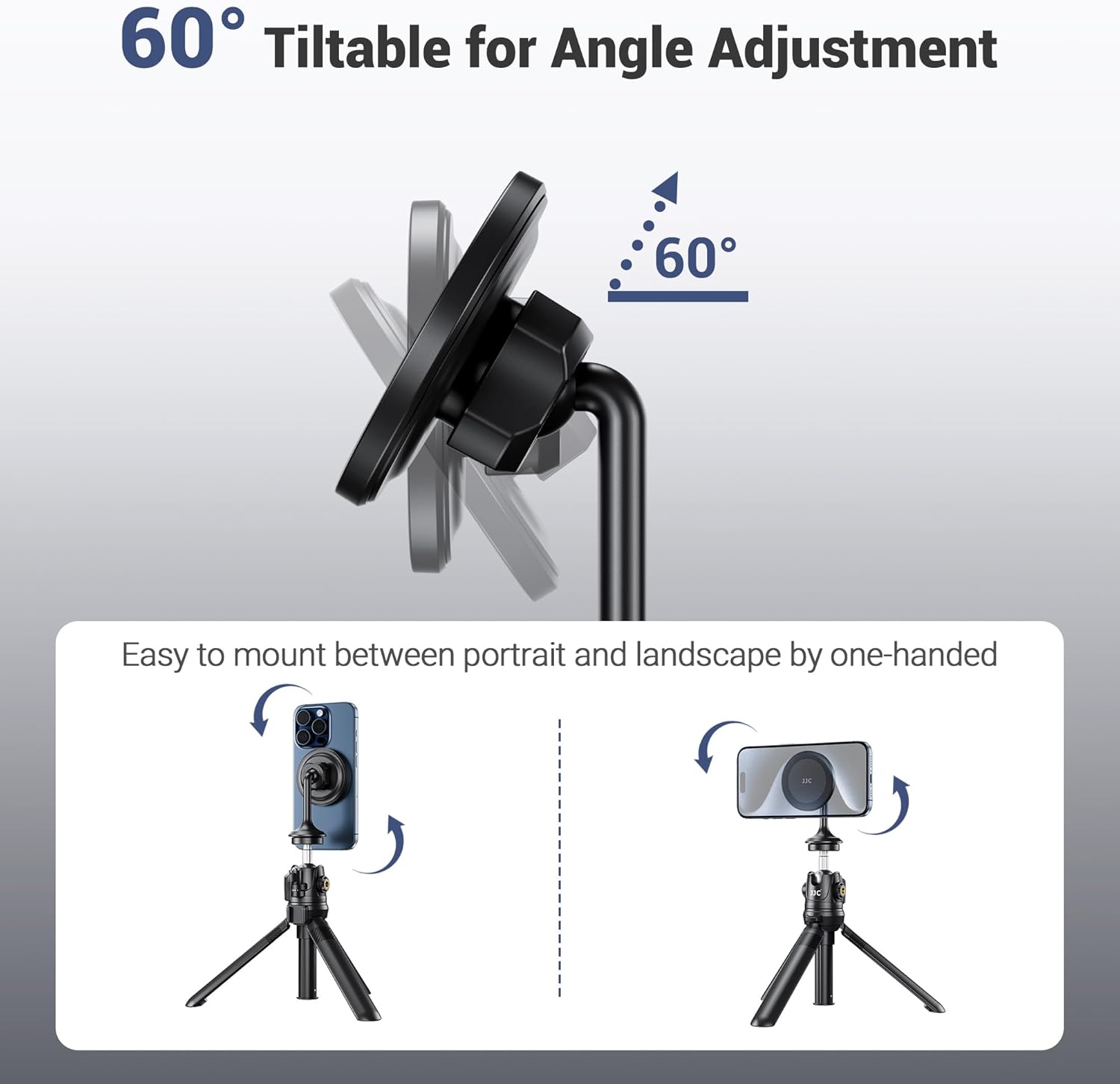 - Multi-Angle Adjustment: By not using a clamp, this phone holder lets you quickly attach and remove your phone to mount it between portrait and landscape. It also supports 60°tilt to meet different shooting angles.