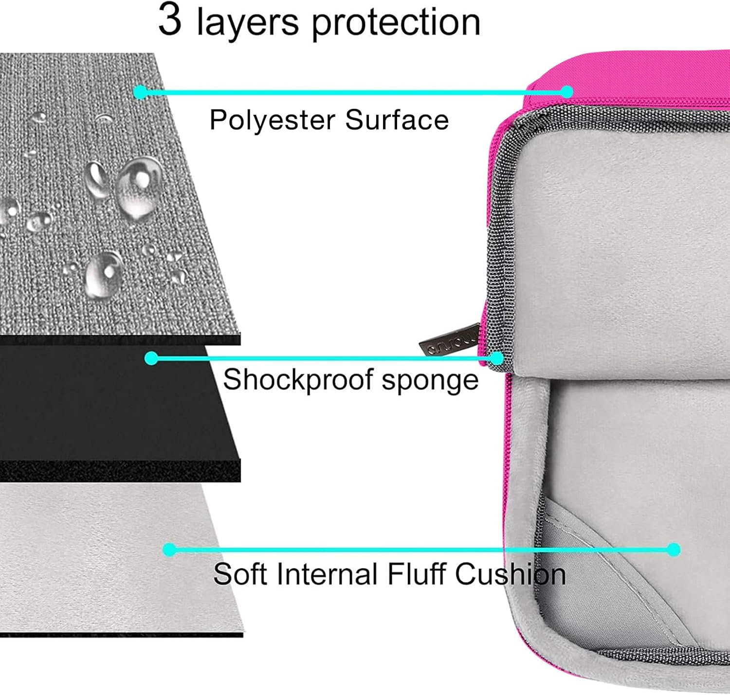 - The 360 degree protective shockproof laptop sleeve with handle carrying bag internal dimension: 13.39 x 9.25 x 0.79 inches (L x W x H); external dimension: 13.98 x 9.84 x 0.79 inches (L x W x H). The front side pocket dimension: 11.61 x 9.25 inches (L x W). Made of polyester material, protect your laptop against accidental spills. Slim and lightweight, does not bulk your device up and can easily slide into your briefcase, backpack or other bag. Ideal for business, daily and travel.