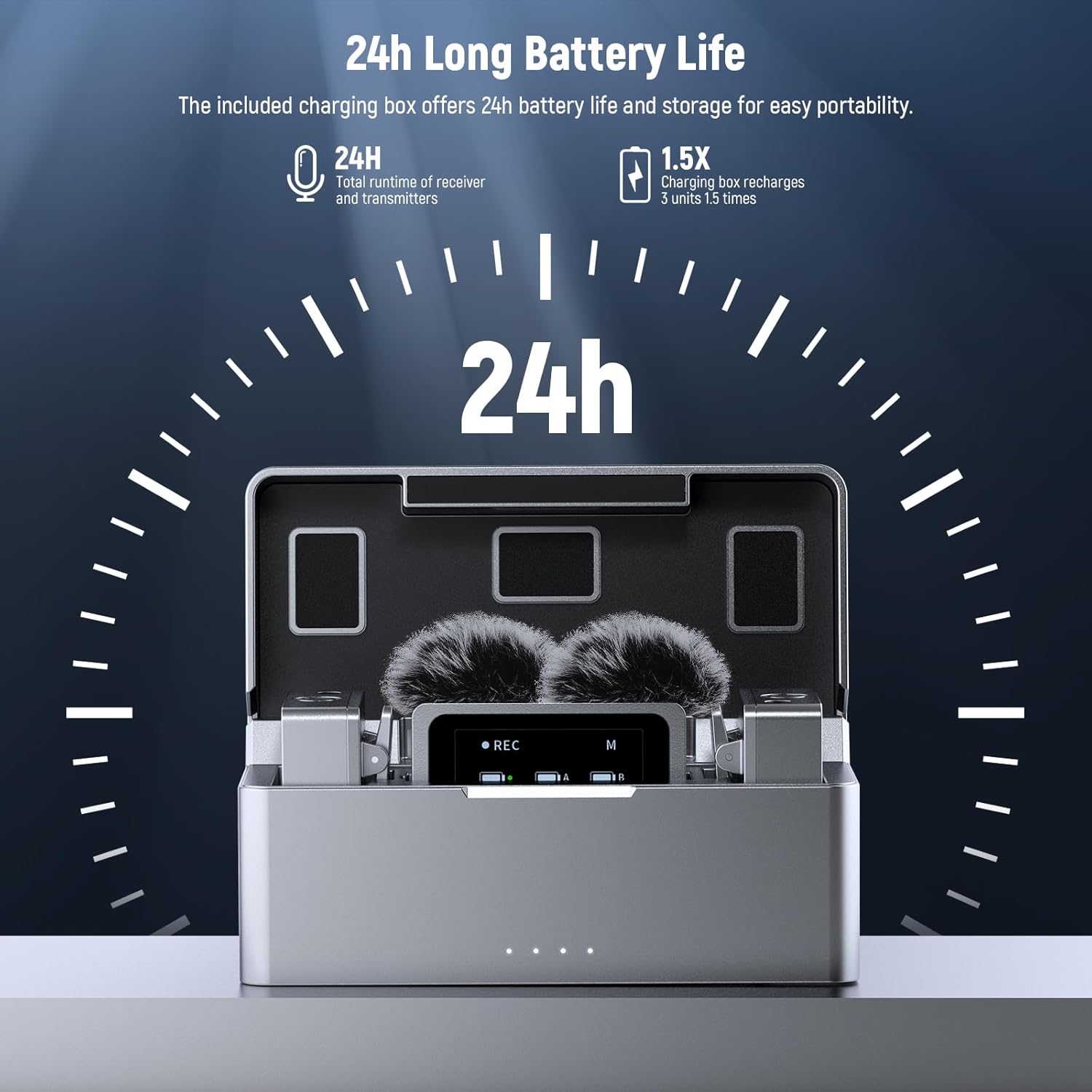 - ă24 Hours of Extended Battery Lifeă With optimized power efficiency, the RX and TX run up to 9.5 hours (REC off). The charging case fully recharges them 1.5 times in about 2 hours per charge, providing a total of 24 hours of useâsufficient for recording all day long