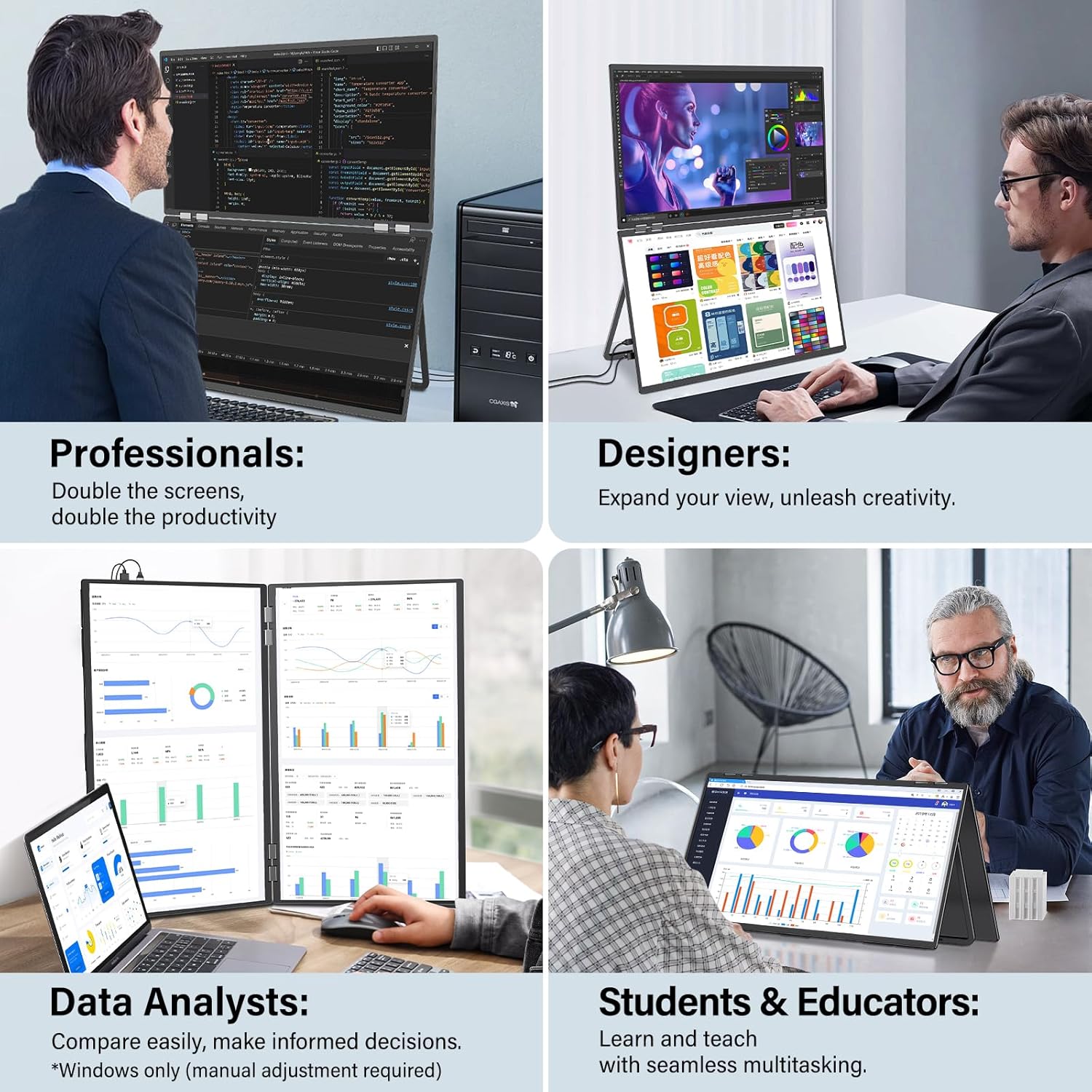 - 【Dual-Screen Flexibility vs. Traditional Large Monitors】 This 23.8-inch dual-screen monitor offers more screen real estate while saving desk space compared to traditional large single-screen monitors. Perfect for multitasking, work, study, and creative projects, you can view multiple apps and documents at once without cluttering your workspace.Note:Please make sure you’re powering the monitor by the original power adapter we provided in the package.