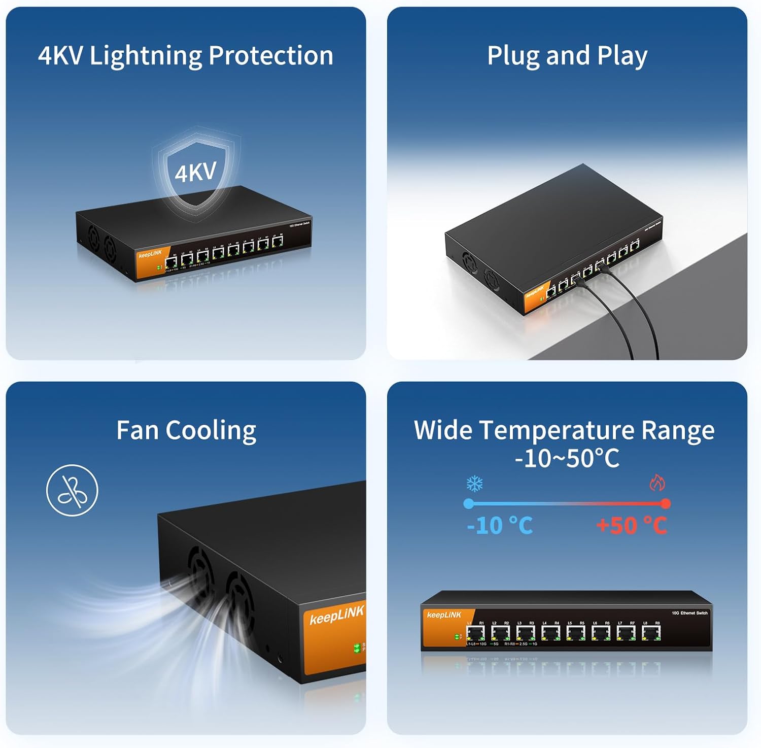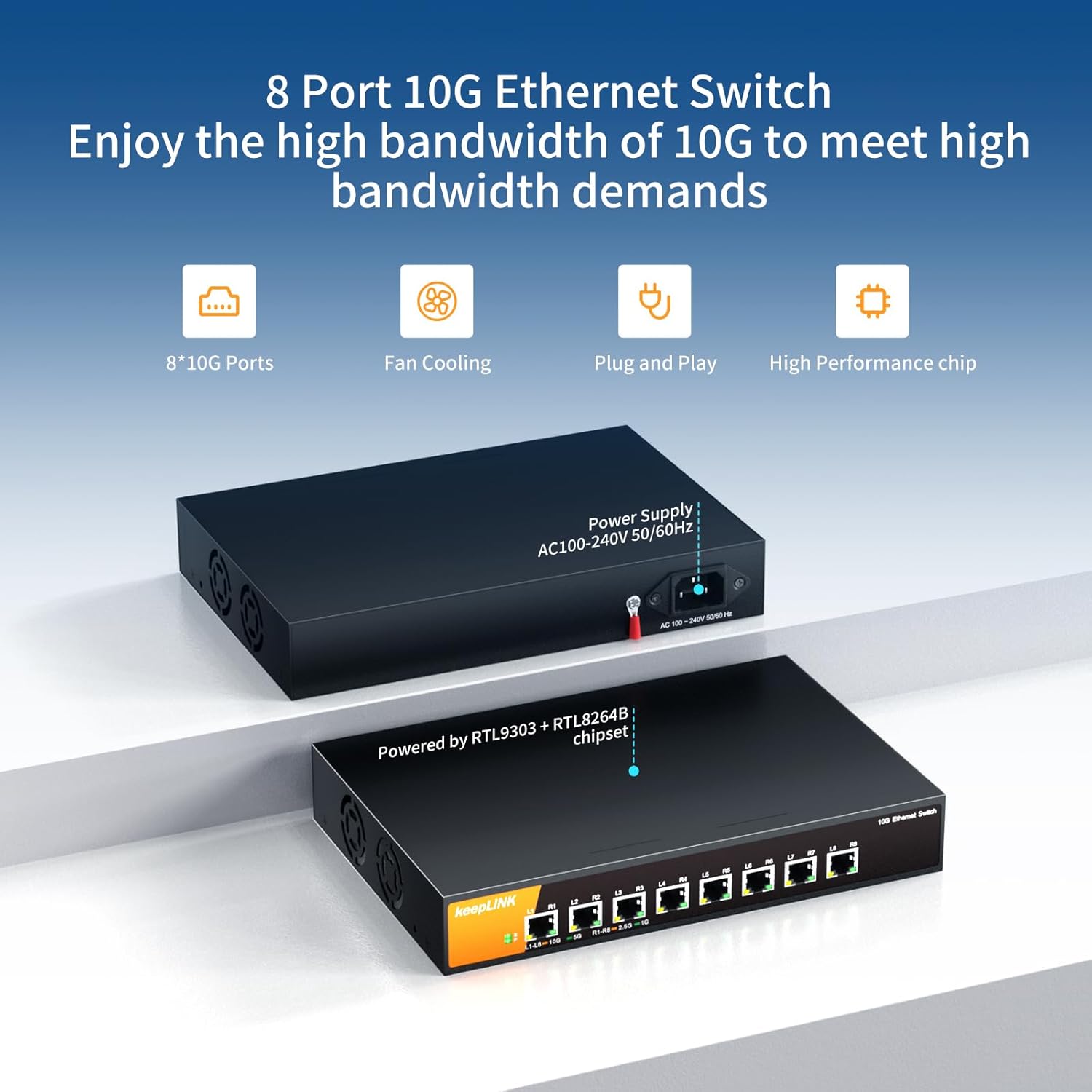 - 【8 Port 10G Ethernet Switch】 8x 10Gbps RJ45 ports support auto-adaptive 10G/5G/2.5G/1G/100Mbps, which provide users with 10G/multi-gig high bandwidth connectivity.