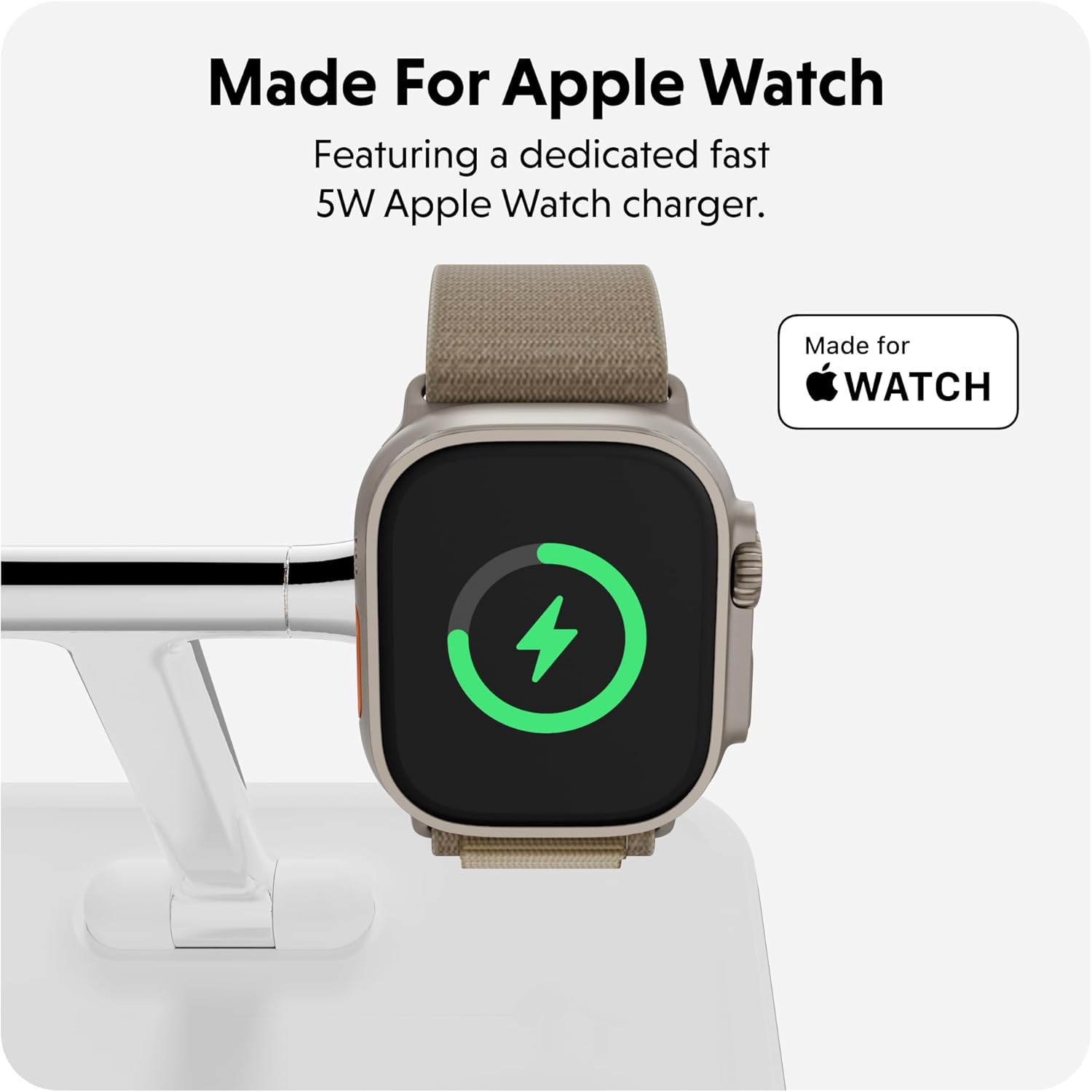 - Charge Four Devices: Say goodbye to cluttered cables. Enjoy simultaneous charging of your iPhone (up to 15W), Apple Watch & Airpods (both up to 5W), and an additional Qi-compatible device (up to 10W).
