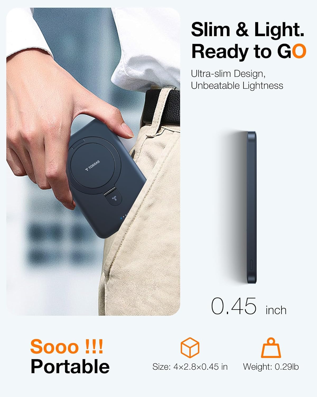 TORRAS 0.45" Slim Magnetic Portable Charger Power Bank for iPhone 5000 mAh 22.5W PD Fast Charging Wireless Battery Pack O Stand Compatible with Magsafe, i Phone 16 Pro Max, Pro,15,14,13,12, Black