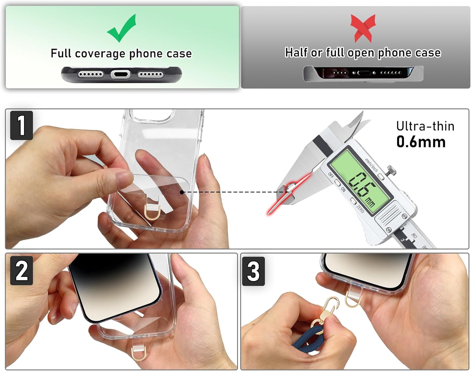 - Easy to install and does not affect charging: Pass the clear Phone lanyard tab through the charging hole of the phone case, attach the smartphone and the metal buckle with the phone lanyard to complete. The phone lanyard tab is only 0.6mm thin and does not affect the charging port or wireless charging or case fitting. There is no adhesive on the phone strap holder, and it can be used freely without leaving any marks inside any iphone case.