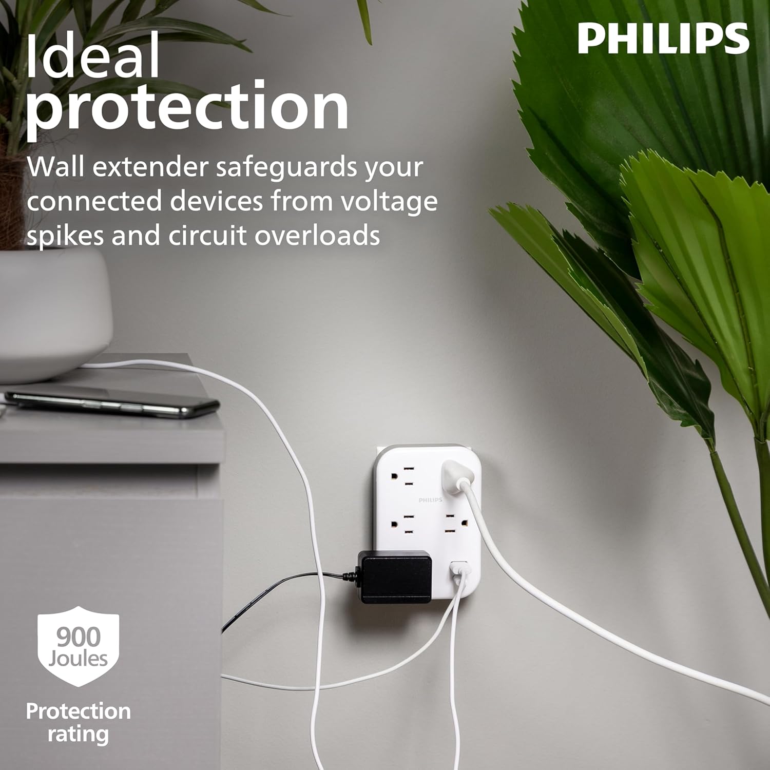 Philips EZFit 5-Outlet Extender Wall Tap with Surge Protection, Grounded Adapter, Charging Station, 3 Prong, 1 USB-A, 1 USB-C, 900J, White, SPP3513W/37
