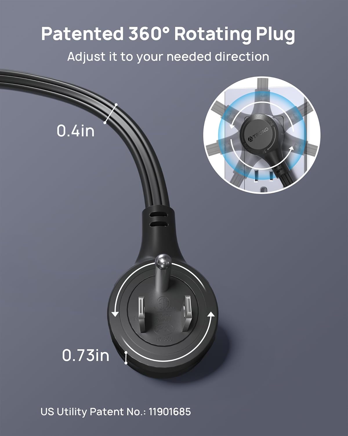 - Patented 360° Rotating Plug: Built with a swivel wall plug(0.73in thickness), the low-profile flat extension cord 10 ft provides convenient access to any weird wall socket from all directions. Especially useful in confined areas like behind wall-mounted TVs. US Utility Patent No.: 11901685