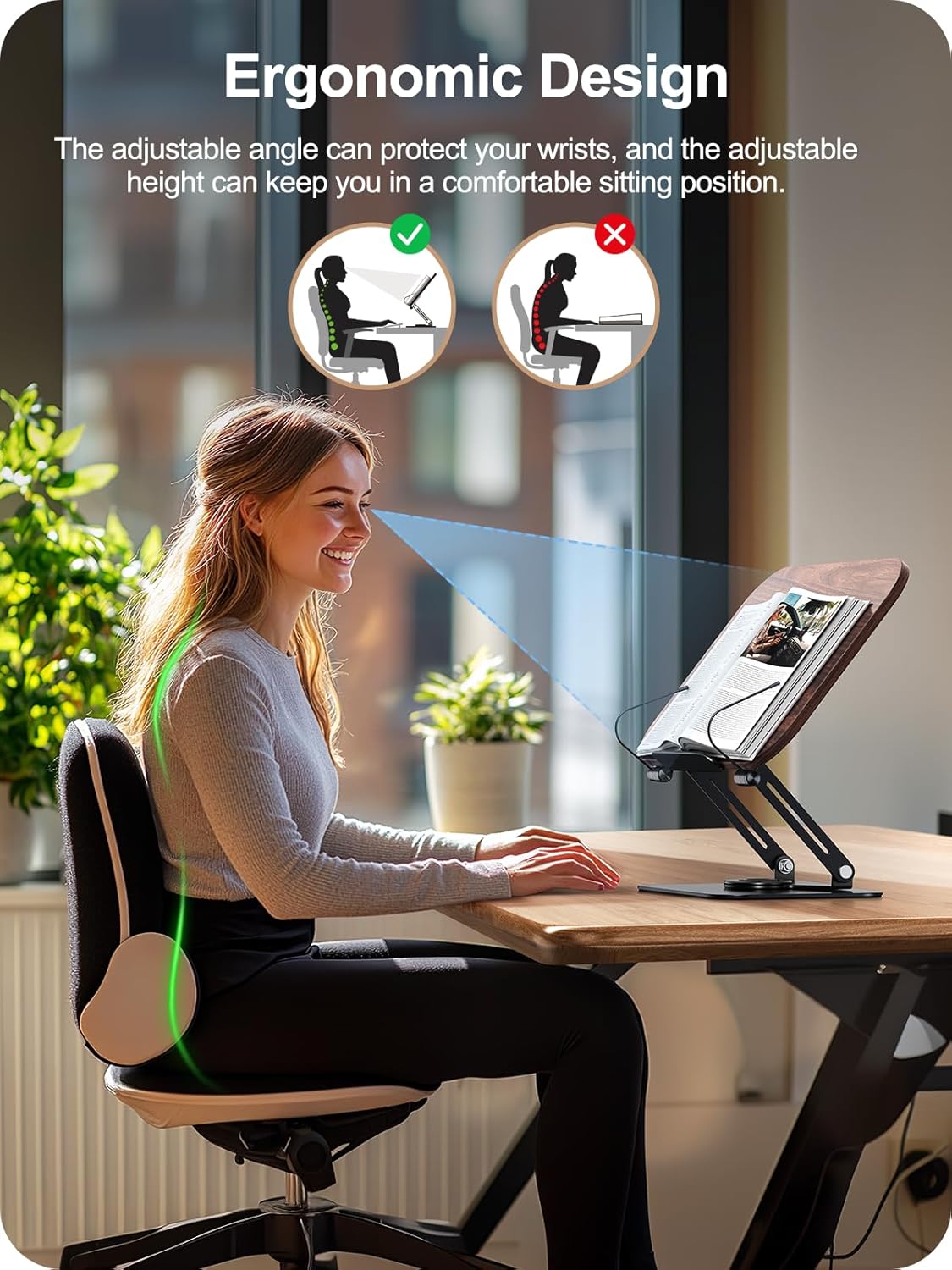 - Stable Book Holder for Desk: The book holder is crafted from natural wood, providing a pleasant touch. The anti-slip pad on the base ensures that the pages stay in place while flipping, and the rotatable elastic page clips firmly secure the edges of the pages, creating a delightful reading experience. The pillars and base are made of high-quality lightweight aluminum alloy with an anti-oxidation coating, ensuring rust-free durability. Whether in a study, classroom, or library, it provides stable support for your books.
