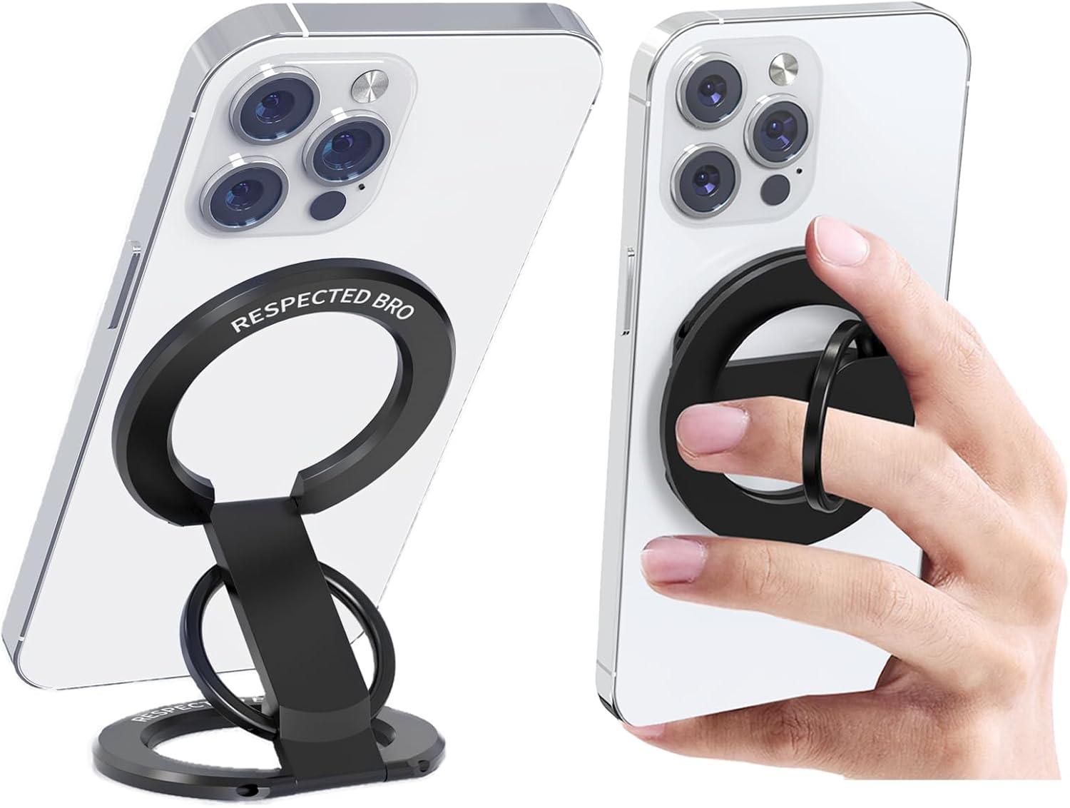 - A THOUGHTFUL AND PRACTICAL GIFT - RESPECTED BRO magnetic phone finger ring grip stand is the perfect gift for anyone who uses a smartphone. With universal compatibility, it works seamlessly with the iPhone 12-16 series, MagSafe cases, and even non-MagSafe devices by simply attaching a metal ring (2 rings included). Whether you are a tech enthusiast, homemaker, busy professional, or fitness enthusiast, this versatile accessory offers a secure grip, adjustable angle for hands-free use, and the convenience of magnetic attachment. Compact, practical, and stylish, it is a thoughtful gift that enhances everyday life, keeping your phone stable and easily accessible at all times.