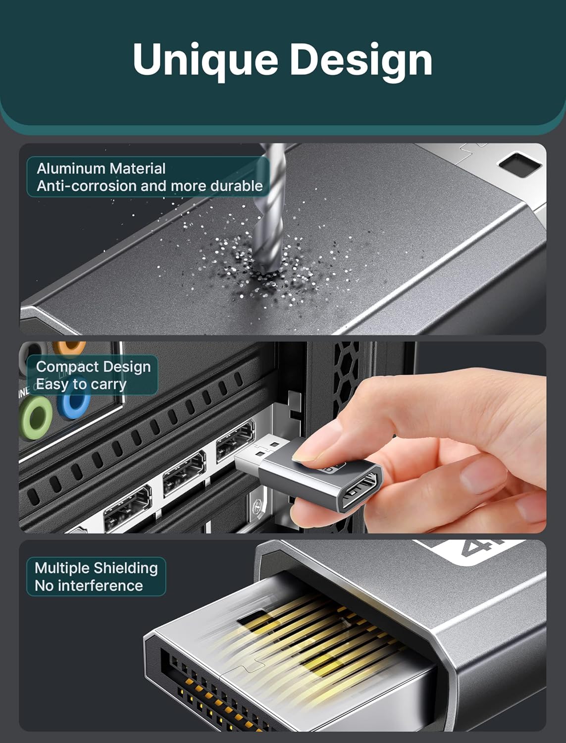 - 【Design】The compact, space gray aluminum adapter sticks to the HDMI cable or computer, won’t block other ports, and allows easy multi-display setups