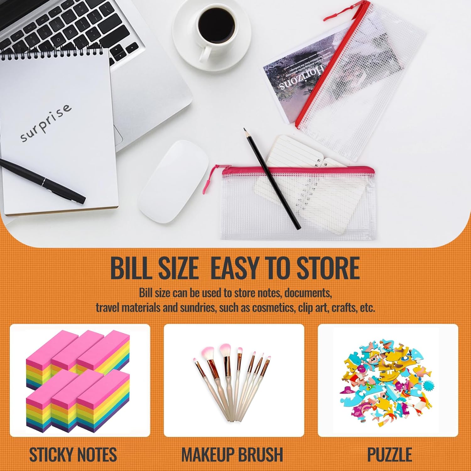 - Perfect Size: 9.3" x 4.7" (Bill size) is perfect for item storage. Plastic zipper pouches can be used for makeup supplies and banknotes storag