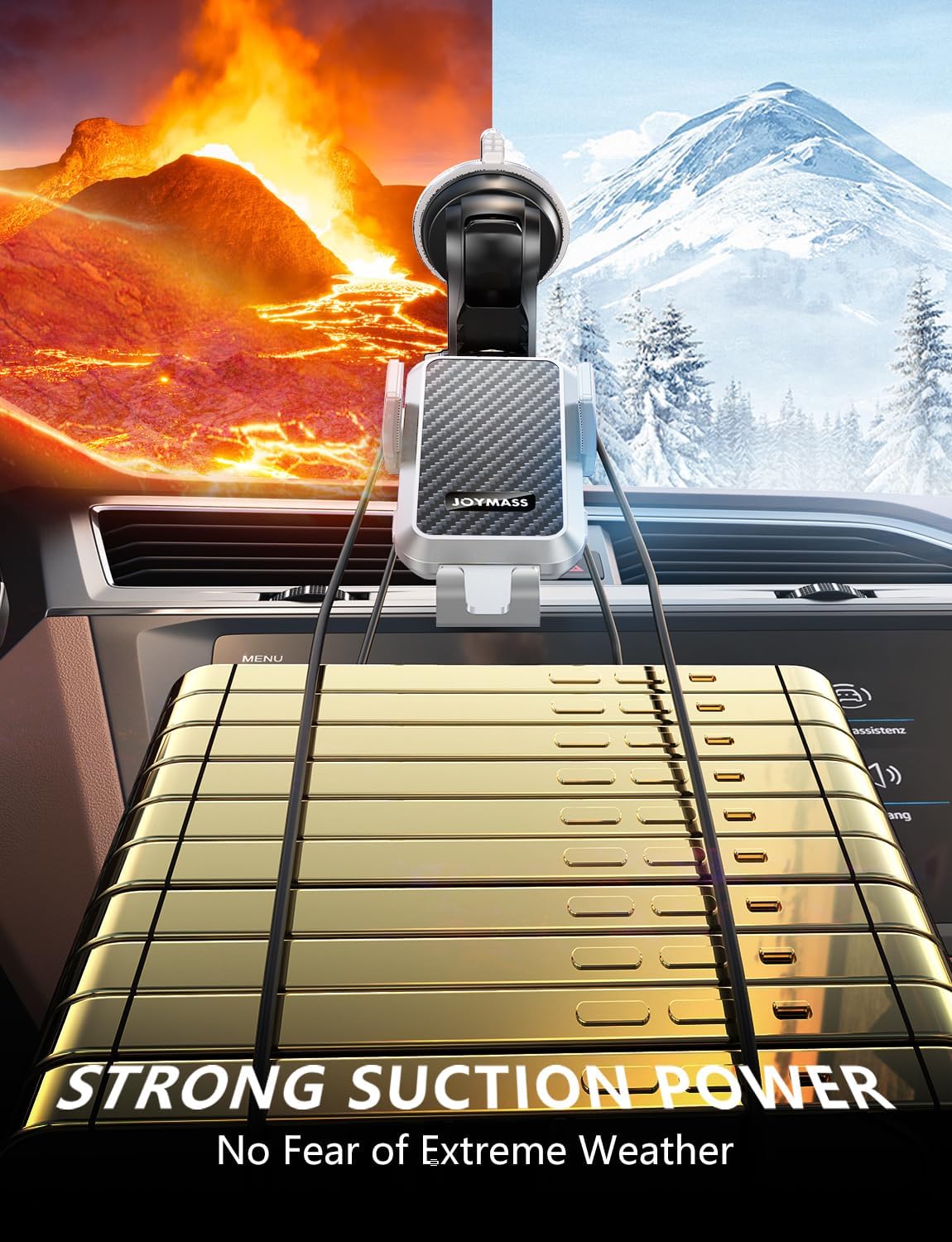 - ăSTRONG SUCTION POWERăAfter several improvements and tests, cell phone car mount firmly grips and stands up to severe shaking from rough, washboard infested dirt roads. Even in the scorching sun, the suction has remained rock-solid, keeping the holder firmly in place. Suction cup can be reused and restored by simply rinsing under warm water and air drying
