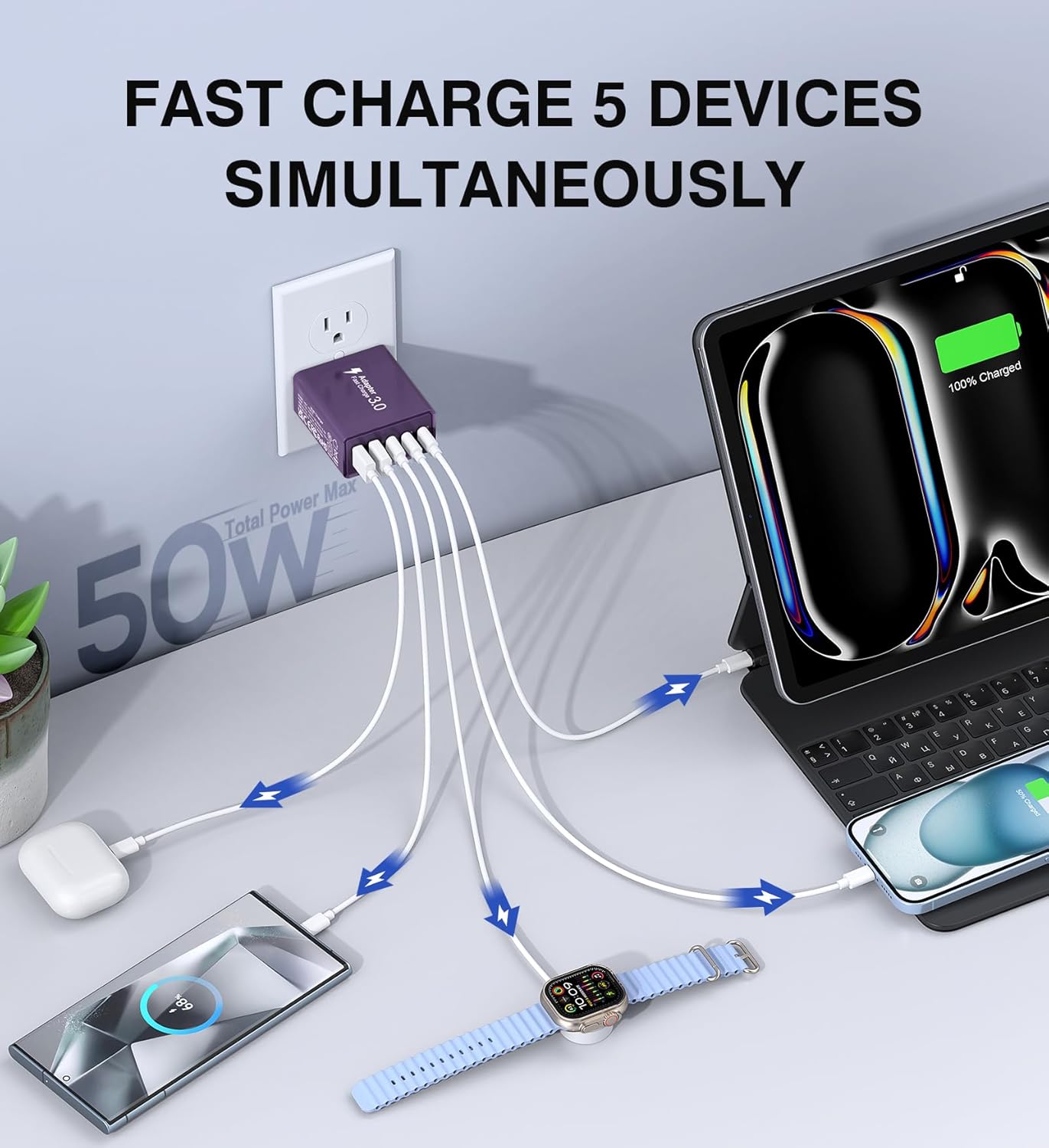 - Compact and Portable:The 5-port charging cube boasts an incredibly compact size that enhances portability. All of this power is housed in a pocket-friendly compact body wherever the journey takes you. Perfect for home, office and on the go. Is the best significant other on the go. We offer this 50W 5-port USB C wall charger (cable not included)