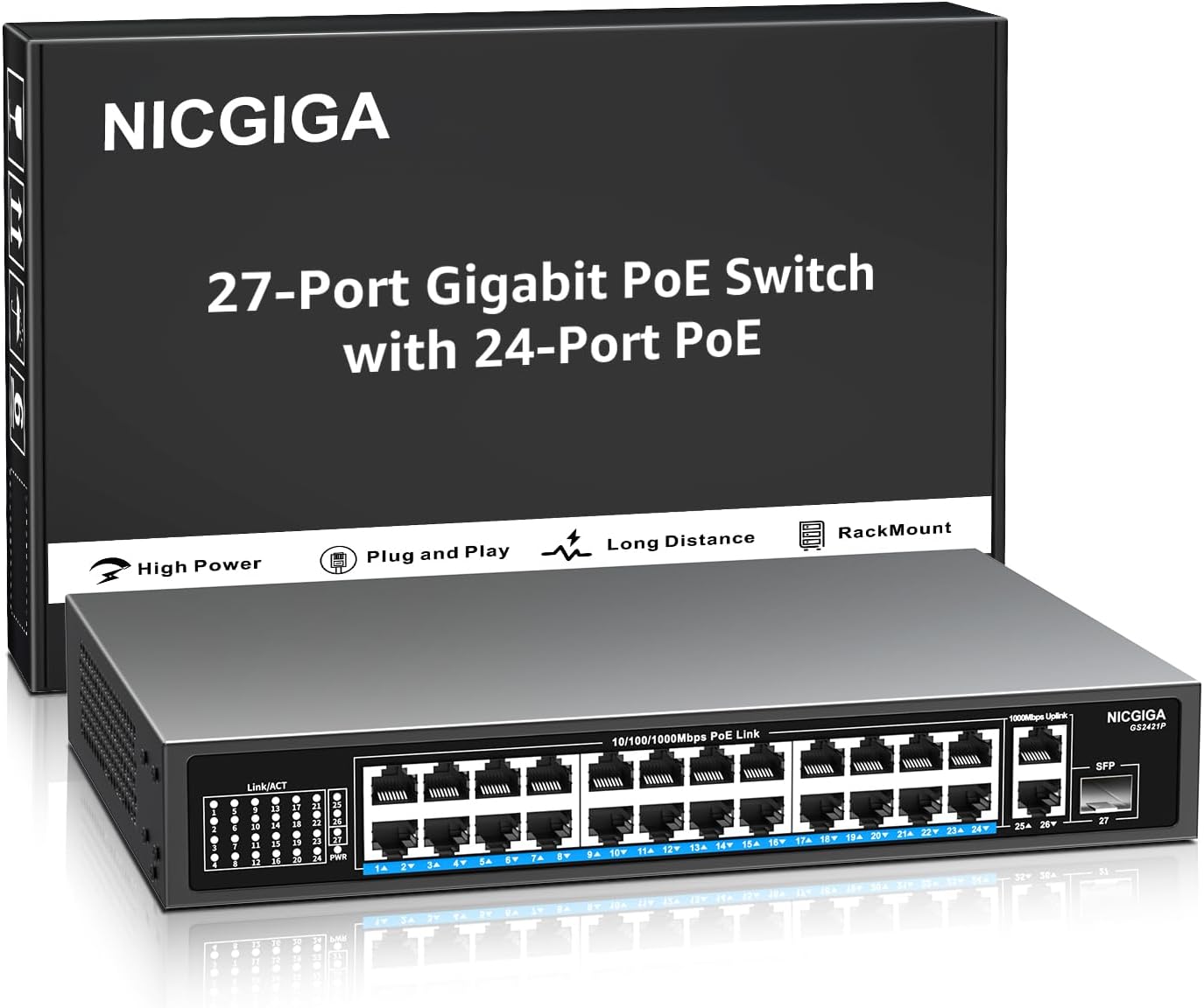NICGIGA 24-Port Gigabit PoE Switch with 24 PoE+@300W, 2 Gigabit Uplink Ports, 1 SFP, Sturdy Metal for Desktop/Rack Mount, Plug and Play, Unmanaged Power Over Ethernet Switch
