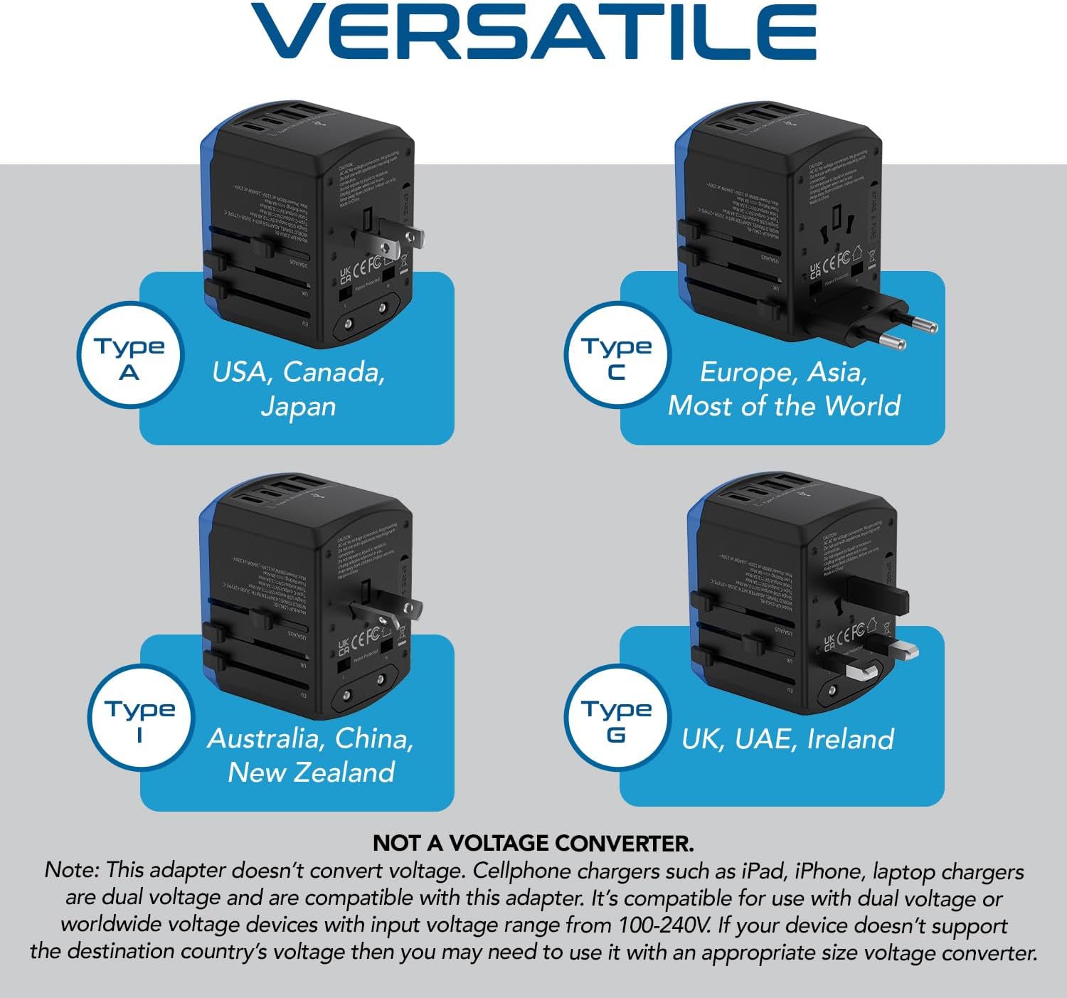 Ceptics Universal Travel Adapter, 5 in 1 Universal Laptop Charger with 2X USB-A & USB-C 3.5A for Mobiles, Laptops, Cameras US, UK, EU, AU, All in 1 Type A, C, G, I Output,