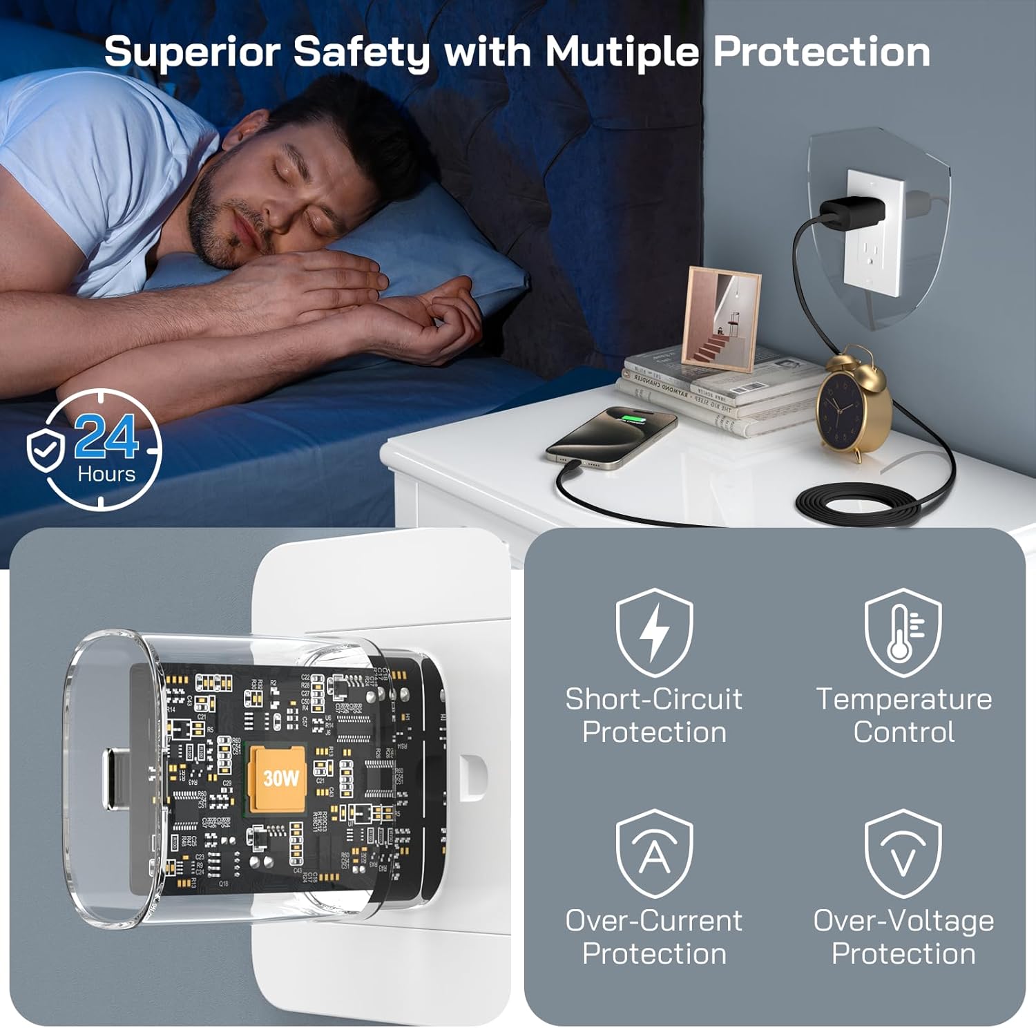 - 【Mutiple safeguards, Assured Safety Fast Charging】30 watt USB C wall charger has passed the UL standard certification and has built-in multiple protection systems to avoid overvoltage, overcharge, overheating and overcurrent. Equipped with upgraded intelligent IC identification technology, i Pad air charger fast charging kit automatically matches your device's charging mode and current for fast, safe and stable charging of your i Phone15 and i Pad.