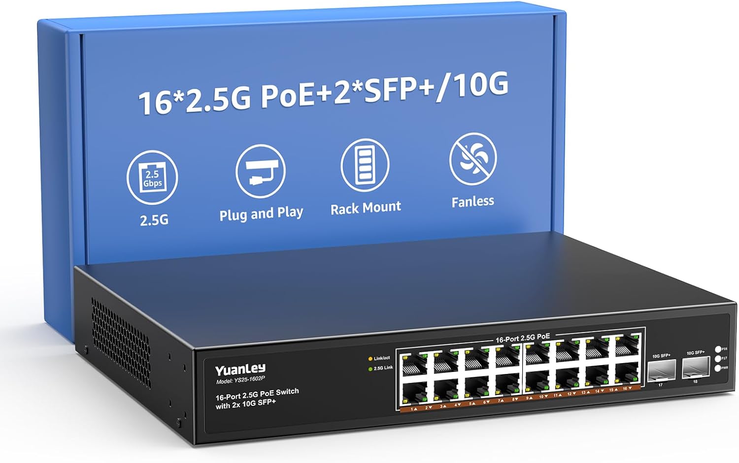 YuanLey 18 Port 2.5G PoE Switch Unmanaged, 16 x 2.5G Base-T PoE Ports, 2 x 10G SFP+, IEEE802.3af/at, 250W, Compatible with 100/1000/2500Mbps, Metal Case, Desktop/Rack Mount 2.5Gbe Network Switch