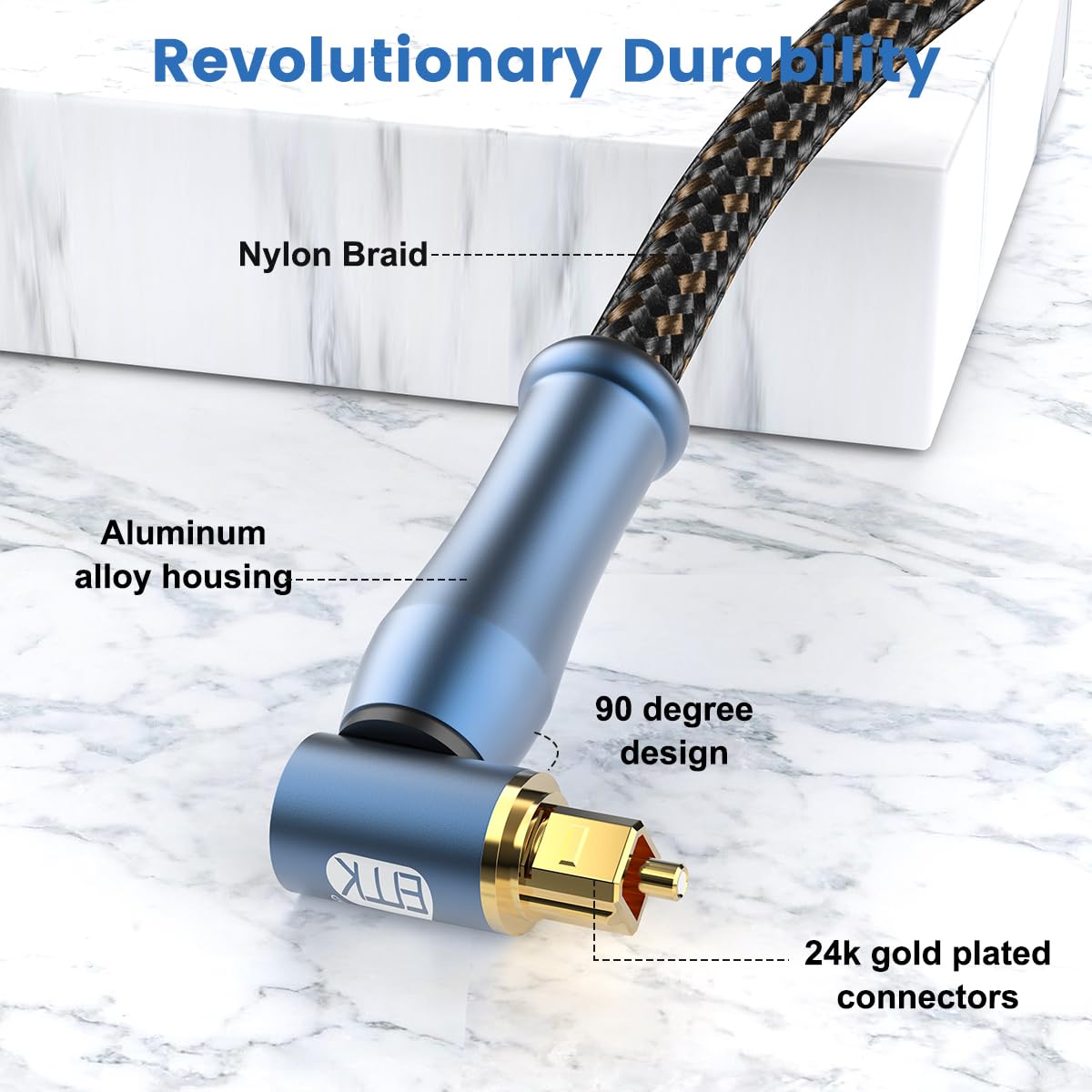 EMK 90 Degree Toslink Optical Cable 24K-Gold Connector 360 Degree Free-Rotating Plug Fiber Optic Cable S/PDIF Toslink Male to Male for Home Theater, Sound Bar, TV, PS4, Xbox (Blue,10ft/3m)