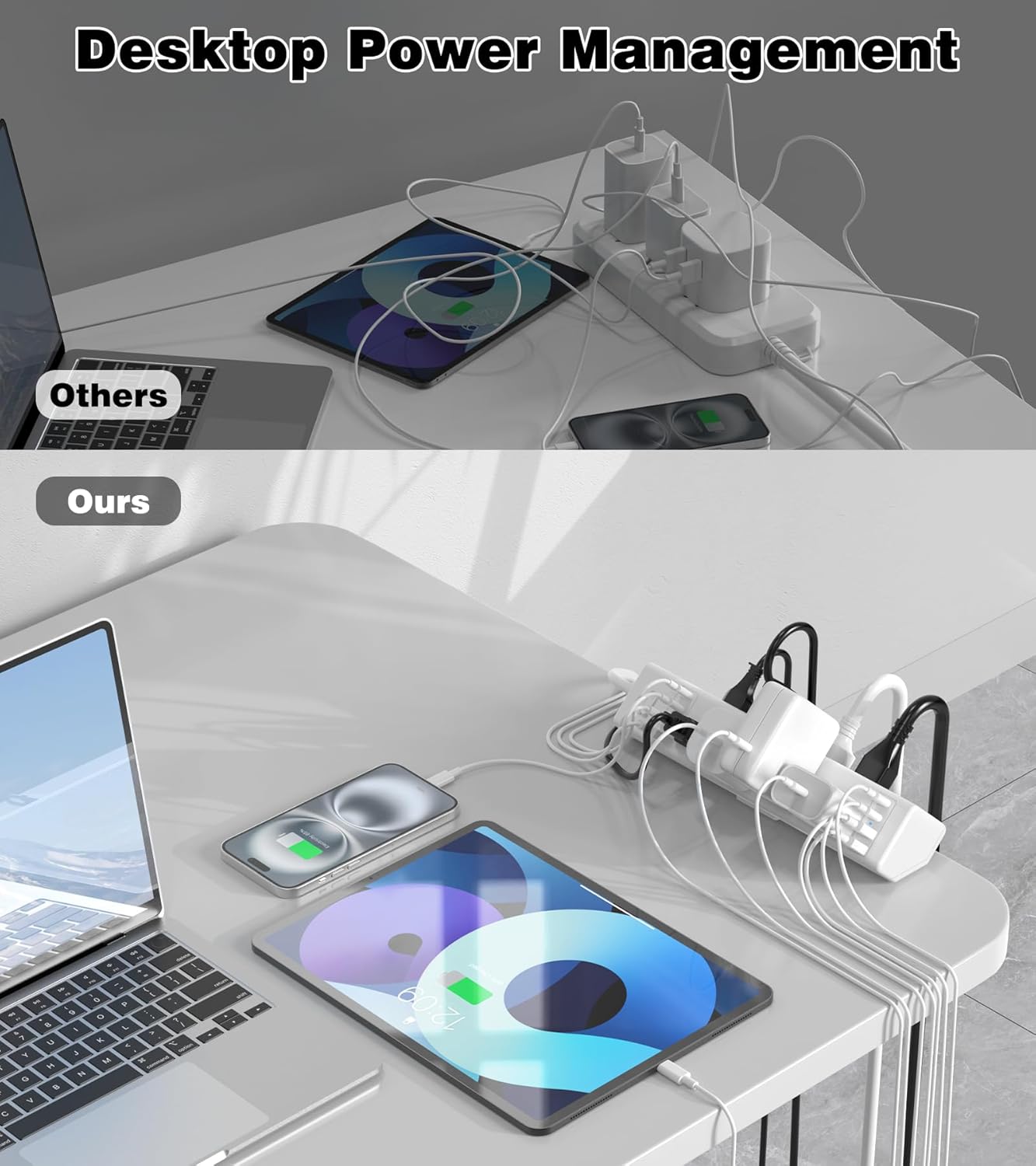 - 【Desk Clamp Power Strip with Surge Protection】Constructed from fire-resistant ABS plastic, this power strip offers a 1200-Joule surge protection rating with a built-in circuit breaker to guard against overloads, short circuits, and overheating. Effectively handles voltage spikes to keep your computer and other accessories safe.