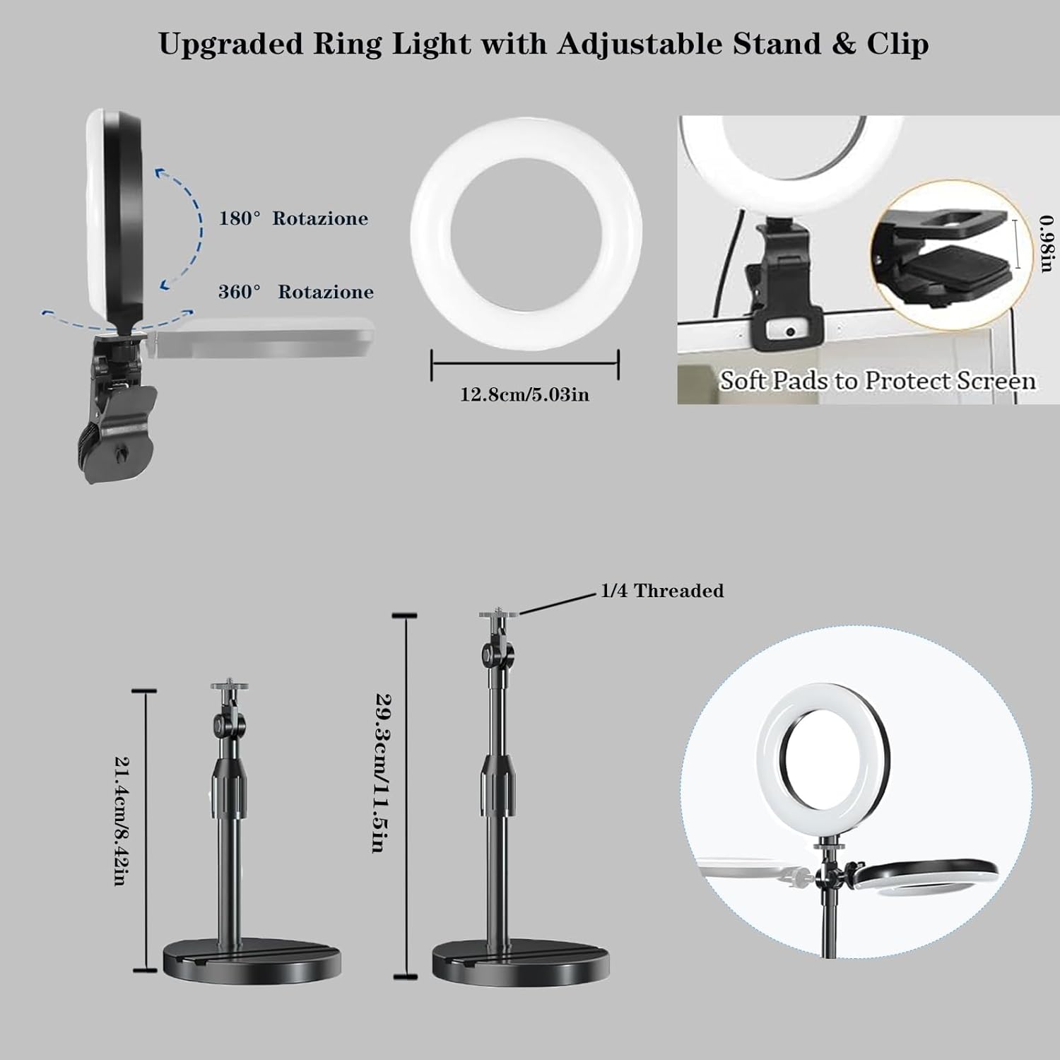 - 【 Extendable Stand 】 The ring light table stand is telescopic, height can be adjustable from 8.5inch/21.5cm to 11.53inch/29.3cm and light head with 180° adjust perfect angle. Ideal computer light for laptops, desktops, webcam light and monitors, ensuring your workspace.