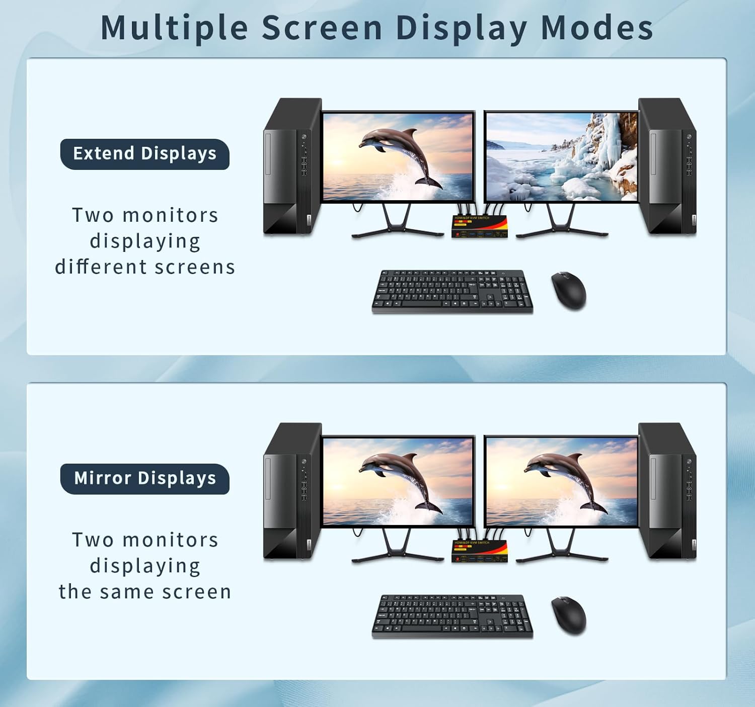 - ăDual Monitor HDMI + Displayport KVM SwitchăThis 8K HDMI DP KVM switch 2 monitors 2 computers, 2 computers support 1 HDMI and 1 DisplayPort input respectively, dual output ports can be connected to two monitors at the same time (1 HDMI monitor and 1 Displayport monitor). Supports duplication mode and expansion mode, which can effectively improve work efficiency and productivity. It also features 4 USB ports, allowing you to control two computers with one mouse and keyboard and share USB devices such as printers. It is compatible with operating systems including Windows/XP, Linux, Mac and others. Note: Each computer needs to have one HDMI and one Displayport output.