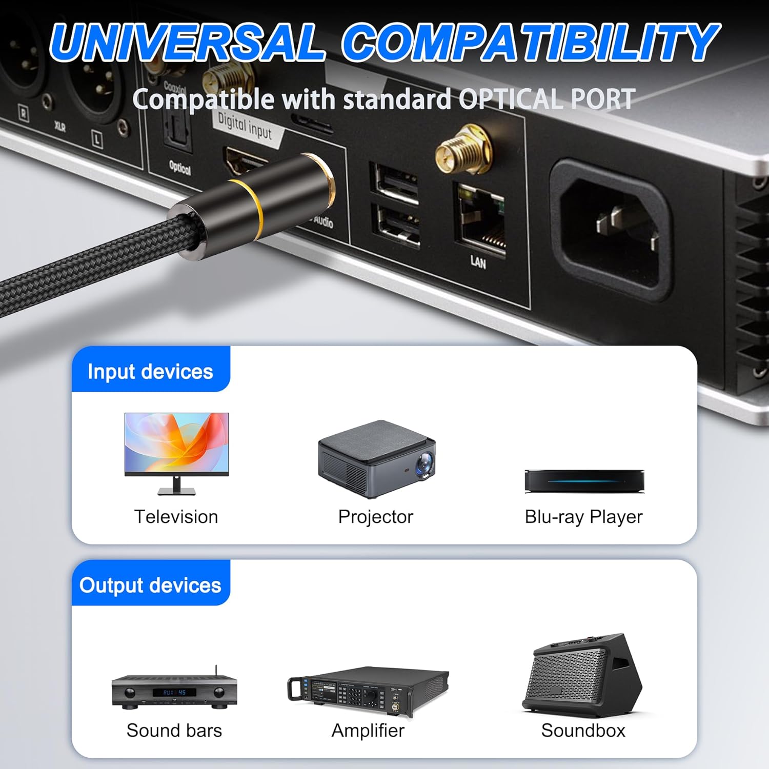 - 【Universal Compatibility】This Digital Optical Audio Cable lets you connect your soundbar and home theater to Amplifier, TV, PS4, Xbox, Blu-ray players, and more with standard Toslink (S/PDIF, optical) ports. Provides clearer and richer sound when gaming or watching movies, giving you an immersive sound experience.
