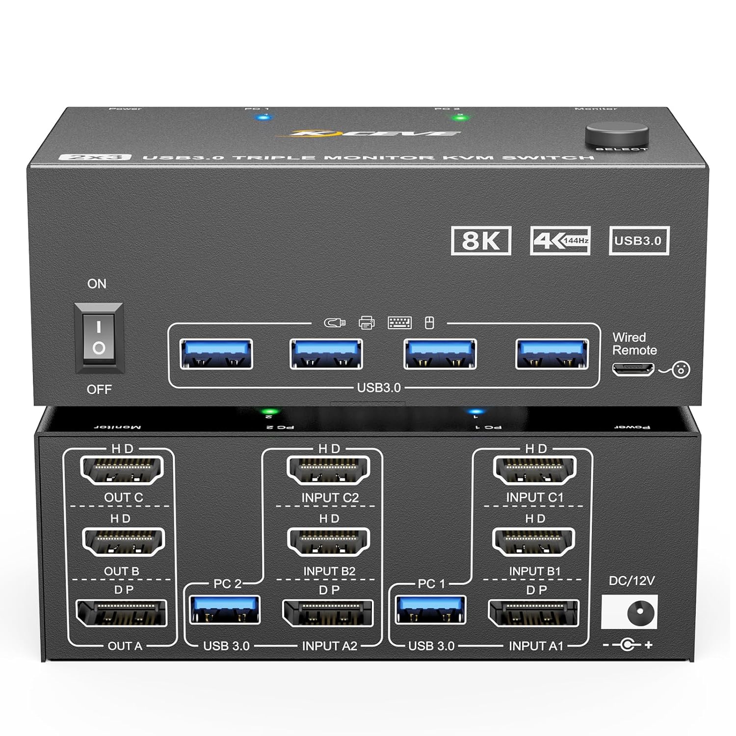 KVM Switch 3 Monitors 2 Computers 8K@60Hz/4K@144Hz, HDMI Displayport KVM Switches for 2 PC Sharing Triple Monitor and Keyboard Mouse with Power Adapter, Wired Extend Controller and USB3.0 Cables