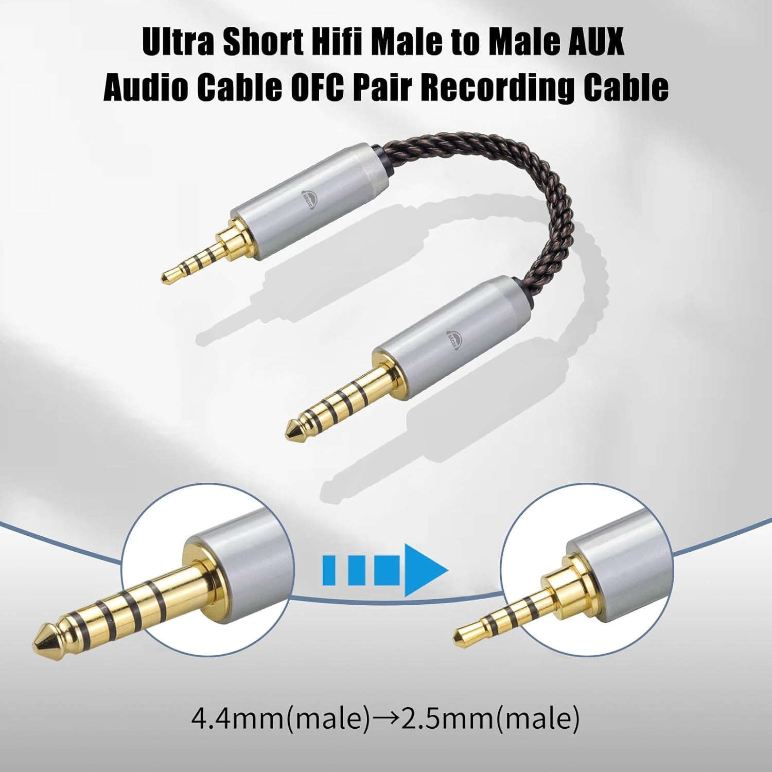 - Male to Male Hifi Cable: Ultra short Hifi Male to Male AUX audio cable OFC pair recording cable. There are six models as follows: 3.5mm(male)→>2.5mm(male) ,3.5mm(male)→>3.5mm(male), 4.4mm(male)→>2.5mm(male), 4.4mm(male)→>3.5mm pro(male), 4.4mm(male)→>3.5mm(male), 4.4mm(male)→>4.4mm(male). Cable length: 5.82 inch is a short auxiliary line. Please make sure to choose the correct length before buying.