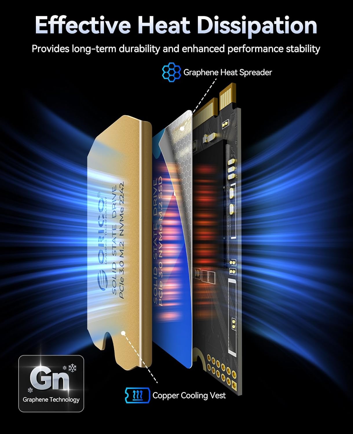 - 【Effective Heat Dissipation】Equipped with a copper heat sink and graphene heat spreader, this SSD ensures efficient heat dissipation, preventing overheating during intensive use. It maintains stable performance and extends the lifespan of your drive