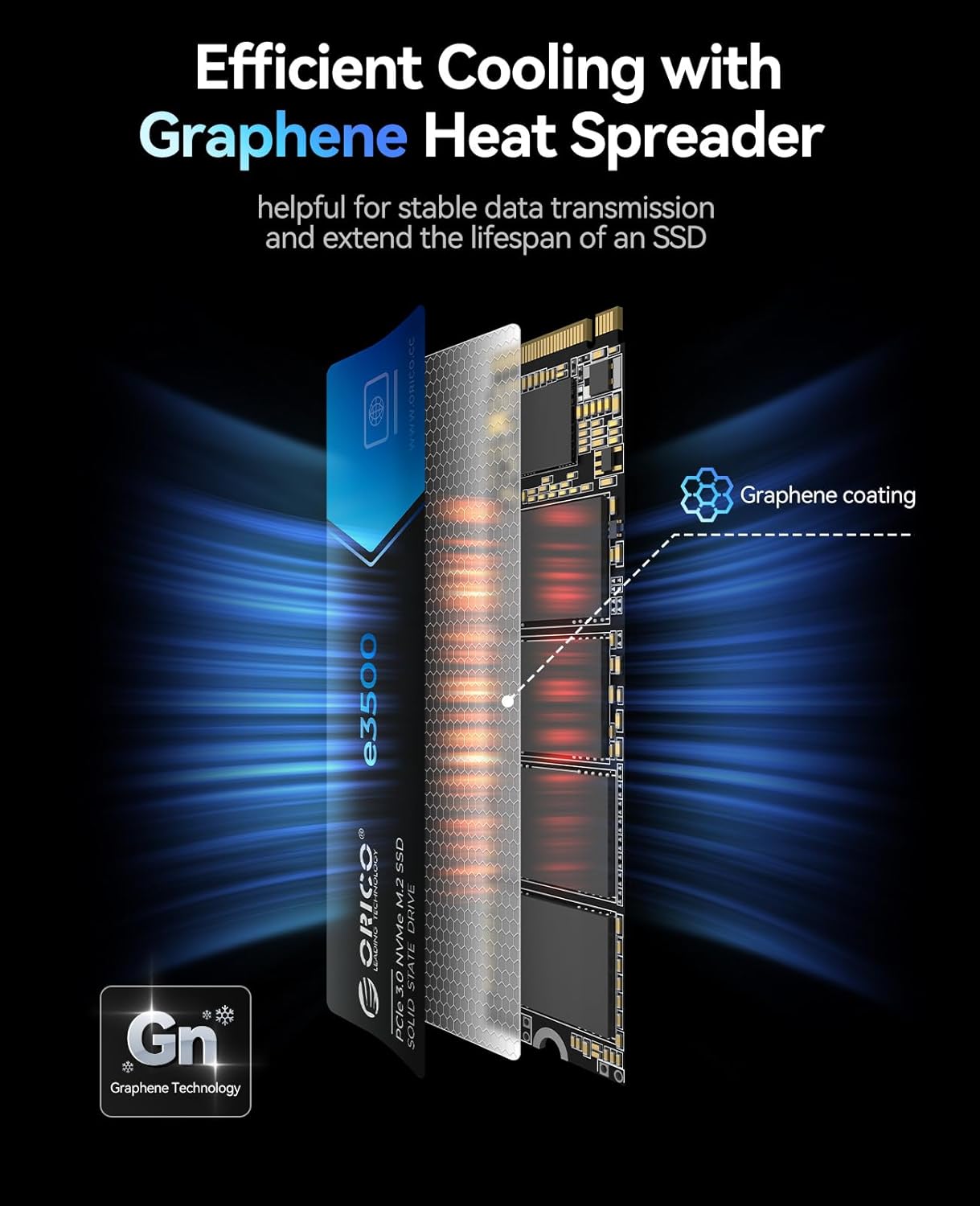- Efficient Cooling: The ORICO M.2 2280 SSD adopts graphene material to cover both the controller and memory chips, significantly reducing thermal build-up. This ensures the SSD won't overheat and lose performance over long sessions, maintaining its excellent capability consistently