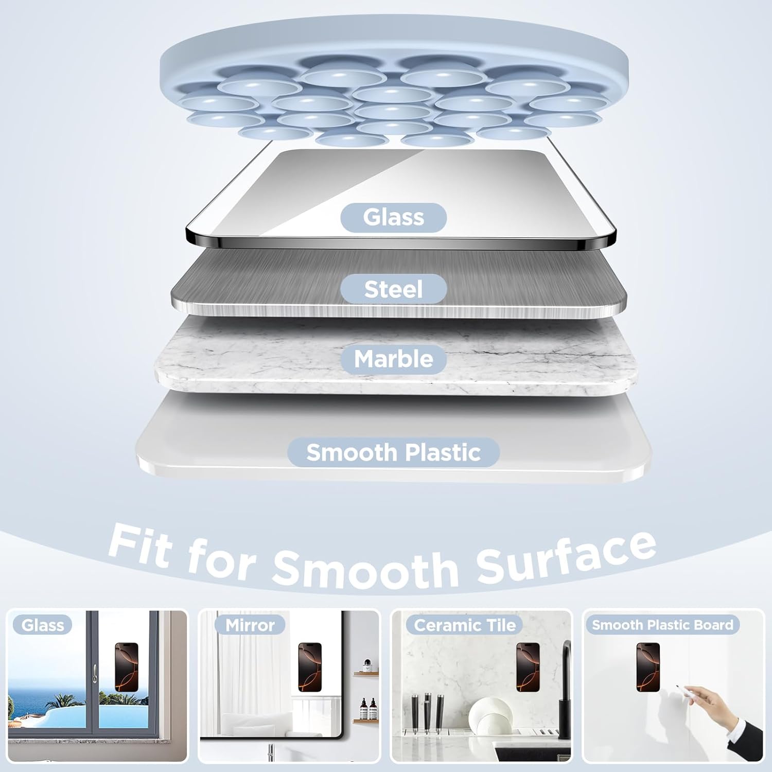 - 【Hands-free Holder】 Effortlessly stick your phone to flat, smooth, and glossy surfaces like mirrors or windows for hands-free selfies/videos, such as vanity mirrors, glass windows, countertops, refrigerators, tiles & even other phones or TVs! stylish and portable, ideal for home, gym, on the go and other scenarios