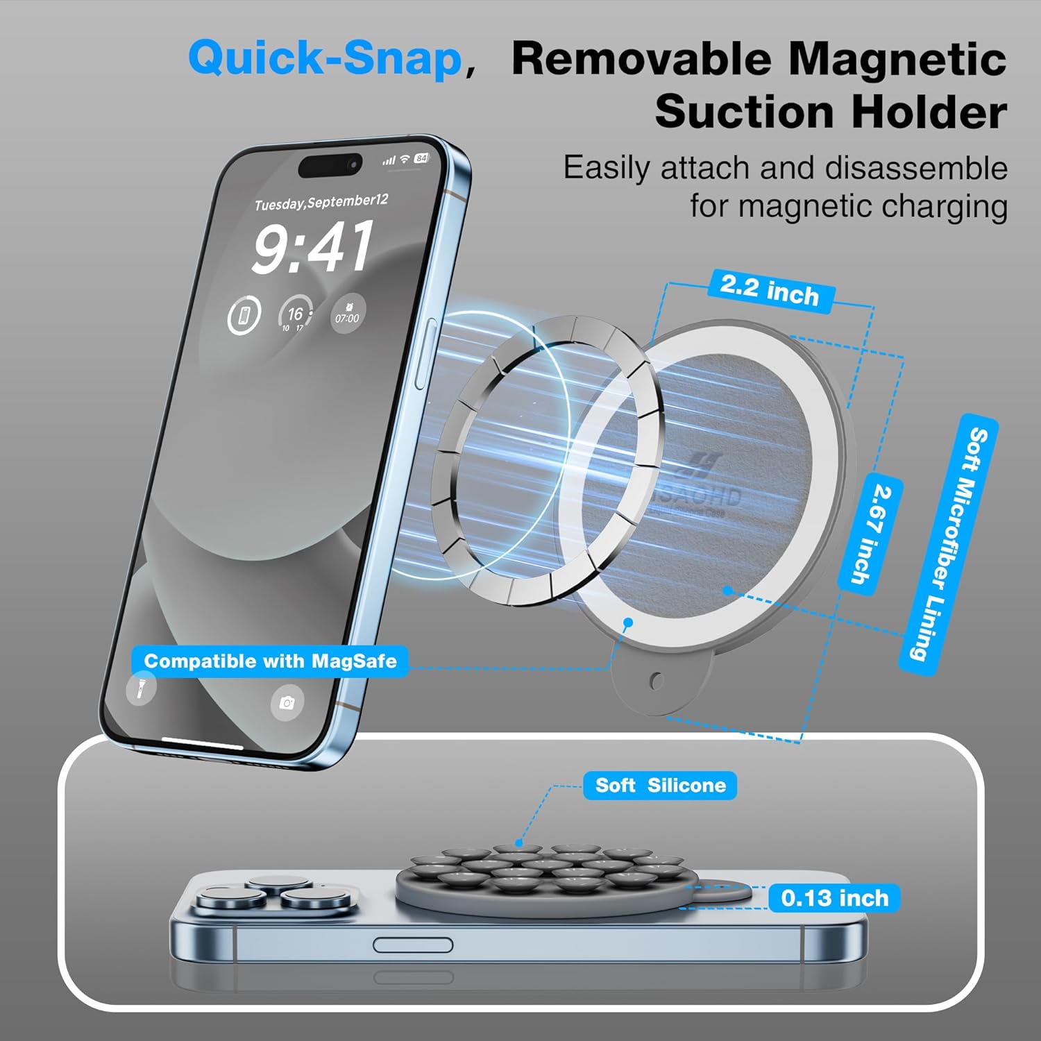 - 【Secure and Convenient】 Silicone magnetic suction cup phone holder with 19 individual suction cups, soft microfibre lining on the back won't scratch your phone, built-in extra wide strong neodymium magnets ensure a secure and long-lasting hold, Easily snaps on when you need it and easily detaches for magnetic wireless charging with no adhesive residue