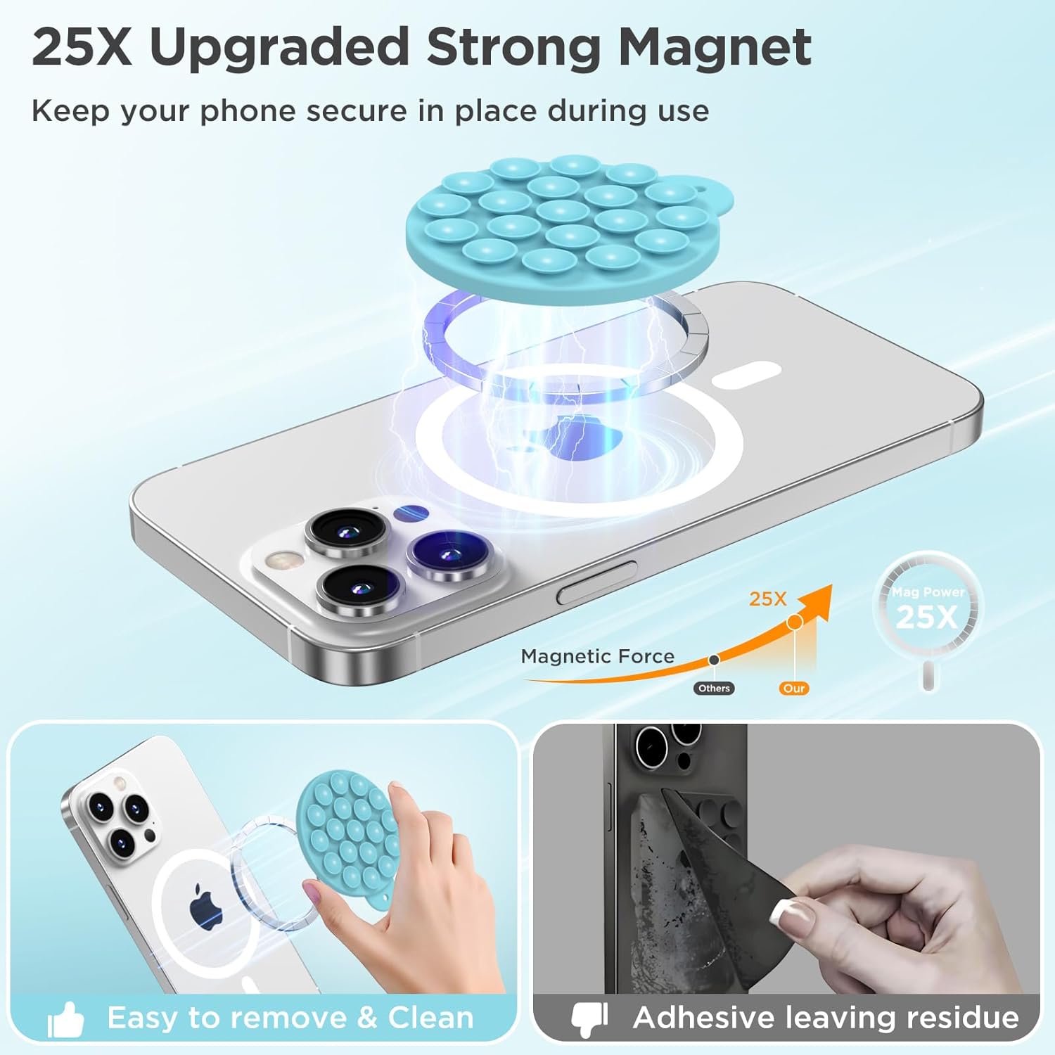 - 【Secure and Convenient】 Silicone magnetic suction cup phone holder with 19 individual suction cups, soft microfibre lining on the back won't scratch your phone, built-in extra wide strong neodymium magnets ensure a secure and long-lasting hold, Easily snaps on when you need it and easily detaches for magnetic wireless charging with no adhesive residue