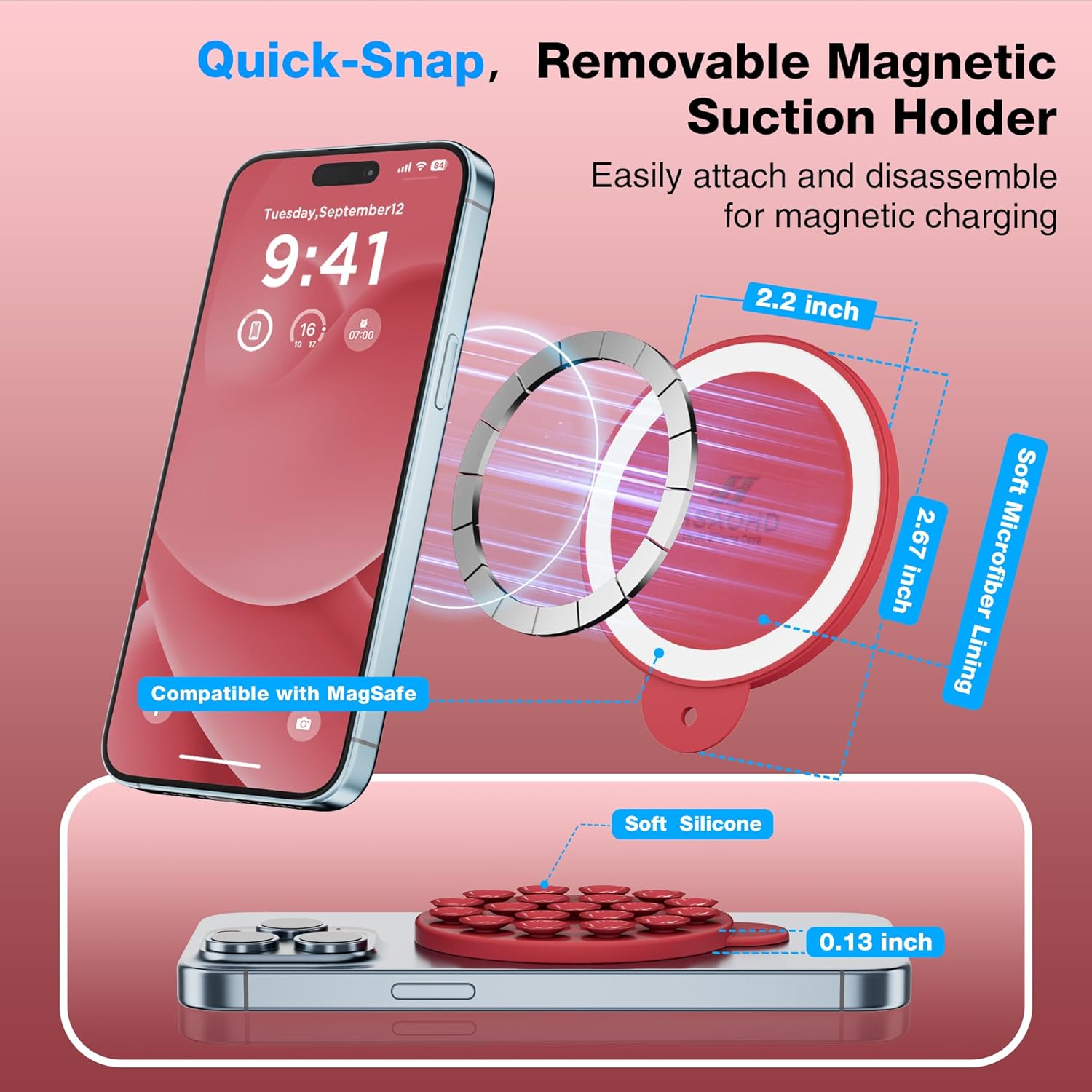 Magnetic Suction Cup Phone Mount for MagSafe Case, Silicone Hands-Free Grip Holder for iPhone and Android, Mirror Shower Phone Stand for Makeup FaceTime Gym Kitchen Bathroom, Deep Red